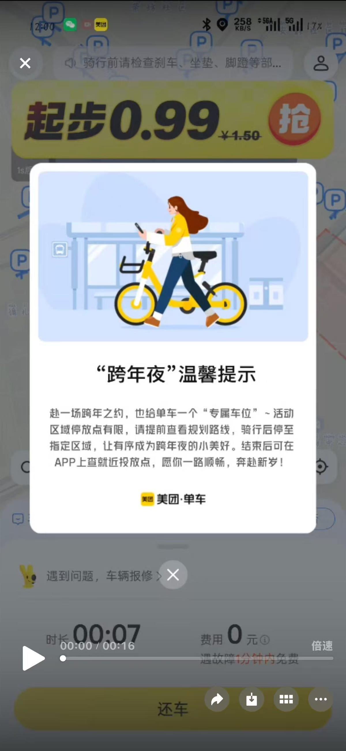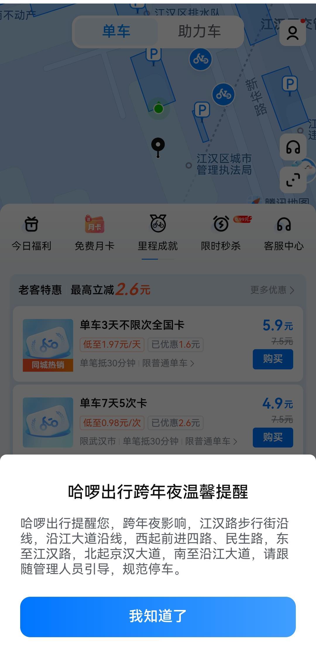 目前,哈啰单车、美团单车已在手机端上线相关提示弹窗(见下图),并在开关车辆时对单车用户进行语音提示。跨年夜活动结束后,哈啰、美团两家单车企业将迅速投放单车至江汉关、江汉路区域相关点位,保障市民游客骑行需求。