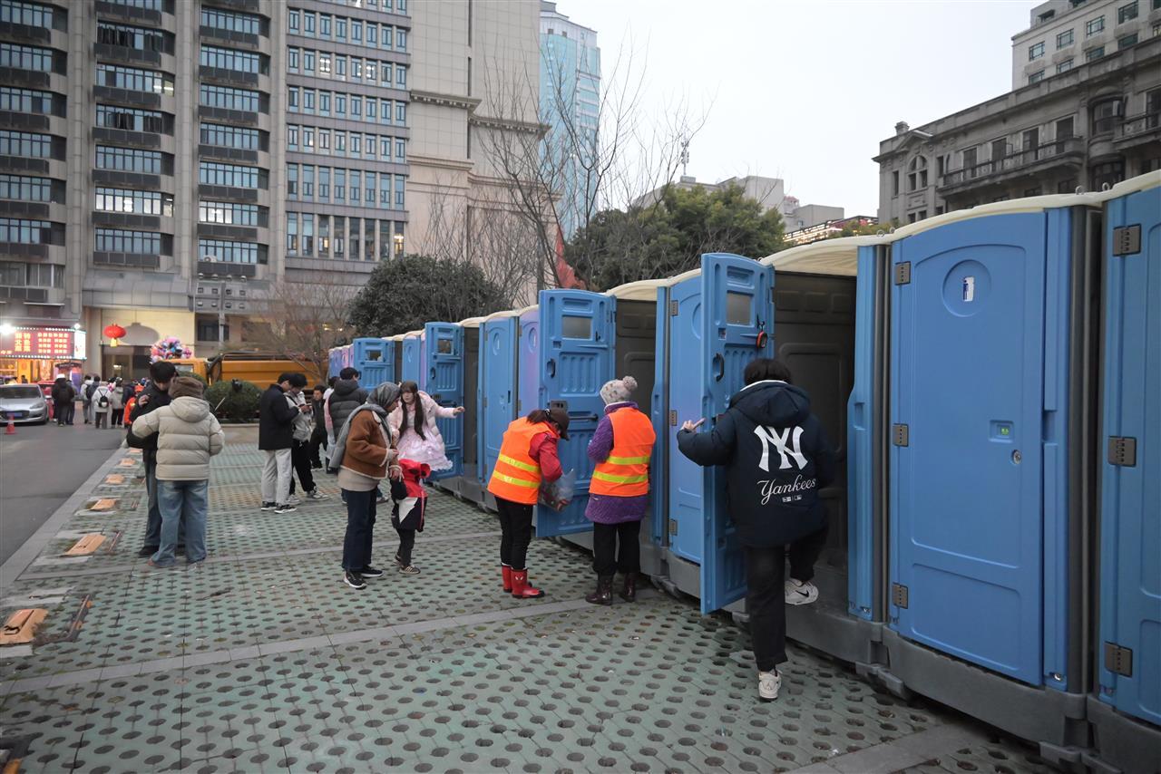 为解决市民如厕需求,环卫部门提前在江汉关、中山大道等地新增60座移动公厕,100个公厕引导指示牌清晰明了,每个点位都配有专人值守保洁。从白日的细致筹备到深夜的雨中坚守,江汉城管用一言一行诠释着责任与担当,让跨年夜的欢乐更安心,让城市的温度直抵人心。