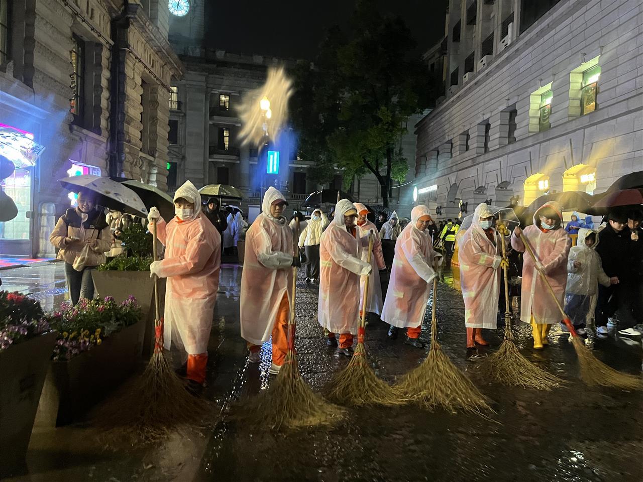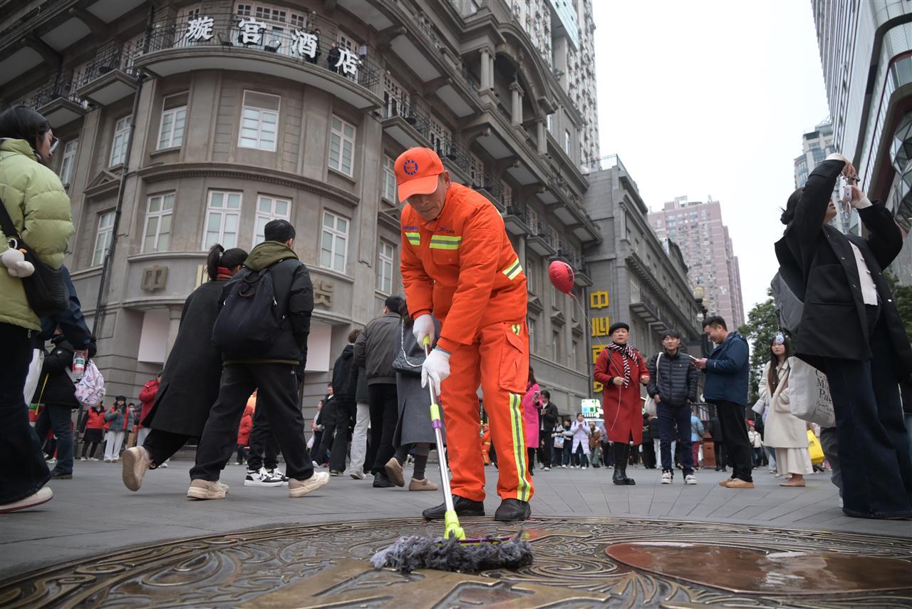 夜幕降临,寒潮裹挟着雨水而至,但坚守从未停歇。针对跨年夜激增的人流与垃圾量,300余名保洁人员在重点区域开展不间断巡回清扫,300个临时增设的大型垃圾桶、6处垃圾临时存放点,搭配17台巡回收运车辆,确保垃圾即产即清。即便雨水打湿了衣衫,环卫工人们依旧穿梭在人群中,守护着街区的整洁。