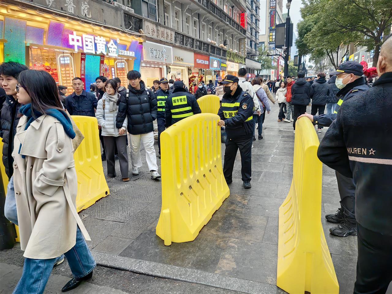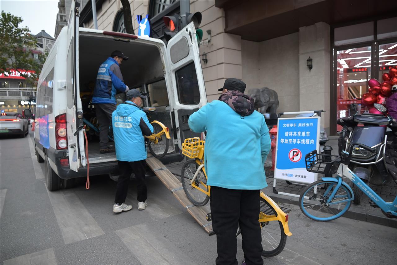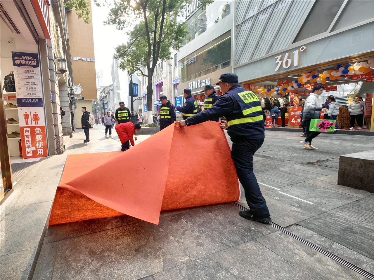 这份守护,从白天开始启动。上午10时,江汉路中山大道城管执法中队的队员们便提前进场,穿梭在江汉路、中山大道的街巷间,细致排查市容秩序,耐心劝导出店经营与流动摊贩,全力清运禁停区域的共享单车,只为确保消防通道与人群疏散通道畅通无阻。同一时间,环卫工人也拿起喷头,对人行道、车行道进行深度清洗,用洁净迎接夜晚的热闹。