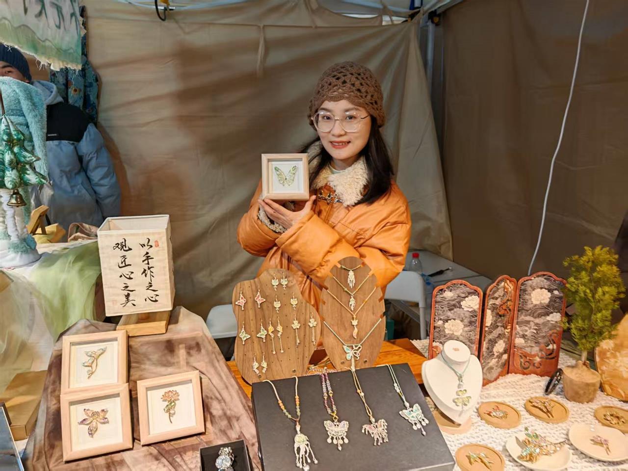 不远处,武汉理工大学研究生小唐正向顾客展示她的螺钿作品。她和男友将传统贝壳镶嵌工艺转化为现代饰品,蝴蝶胸针、贝壳手环等让古老技艺重获新生。“螺钿在古代是家具奢侈品,我想让它走进普通人的生活。”学习服装设计的小唐,因热爱手作而接触非遗,希望更多人感受这项技艺的魅力。