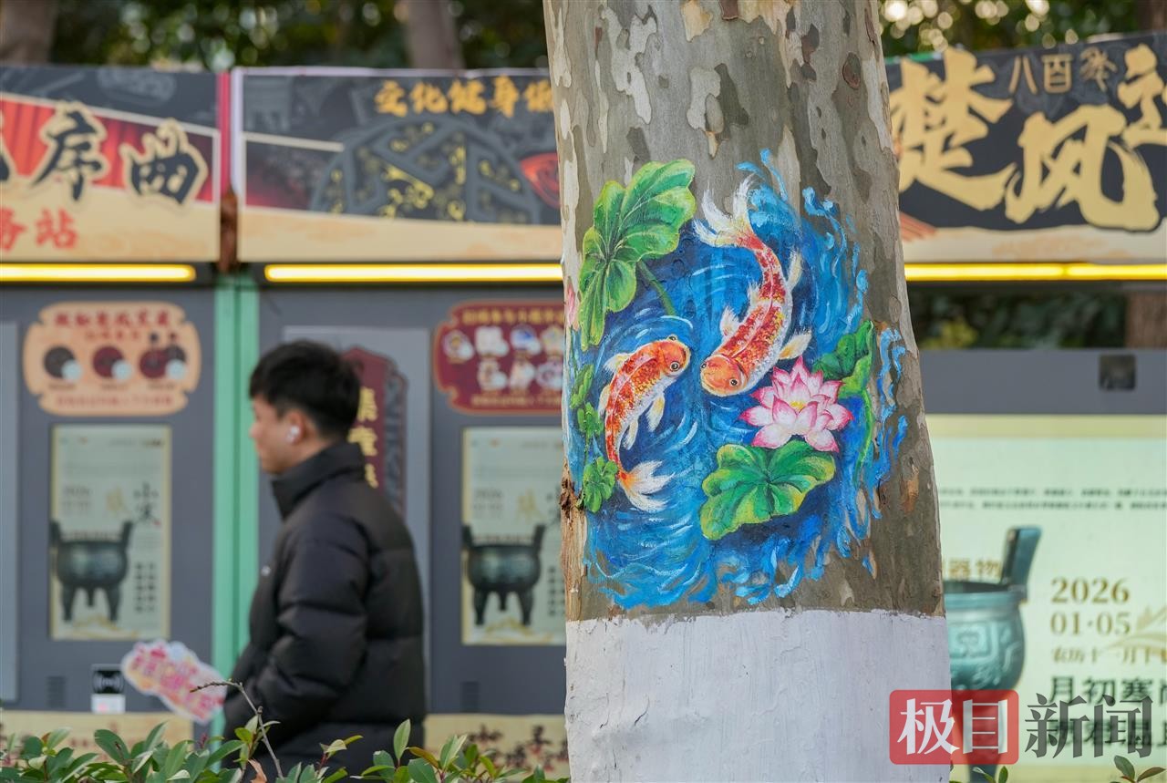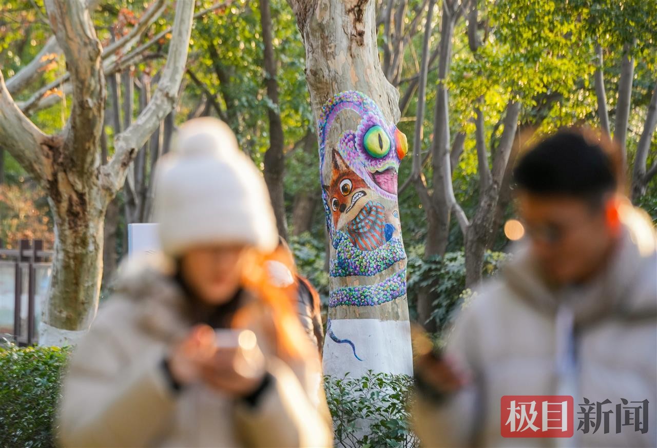 1月8日,记者在东湖绿道楚风园路段看到,手绘师正结合树干形态精心创作,熊猫、兔子、狐狸、小鹿等动物形象跃然树上,部分树干还绘有搞怪表情与自然风光,与湖光山色相映成趣。这些创意装扮采用环保丙烯颜料,既不伤害树木,还能遮盖部分破损痕迹,搭配色彩缤纷的编织“毛衣”,让冬日绿道暖意十足。