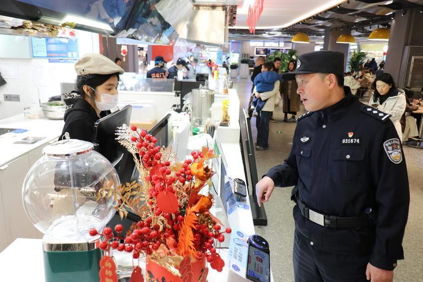 在元旦期间人均20万客流的大型商业综合体内,梅苑派出所梦时代警务室民警肖楠联手“黄鹤卫士”逐一走访商圈餐饮区,对烟道、消防器材、烟雾报警器等设施开展全面的安全隐患排查,推动商圈平安建设,为商户和消费者营造安全稳定的经营消费环境。