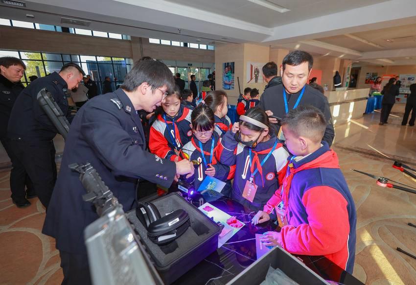 普法与安全互动区同样热闹。法制大队设置的“未成年人保护法答题角”前,少年警队队员们争相举手抢答;治安大队的消防安全竞猜中,“九小场所灭火器多久检查一次”的问题刚抛出,社区代表魏娟立刻报出答案,赢取了定制消防便签。而在反诈中心,民警向前来参观的群众详细展示诈骗预警流程,银行代表曾女士感慨:“这下更清楚如何配合警方止损了。”