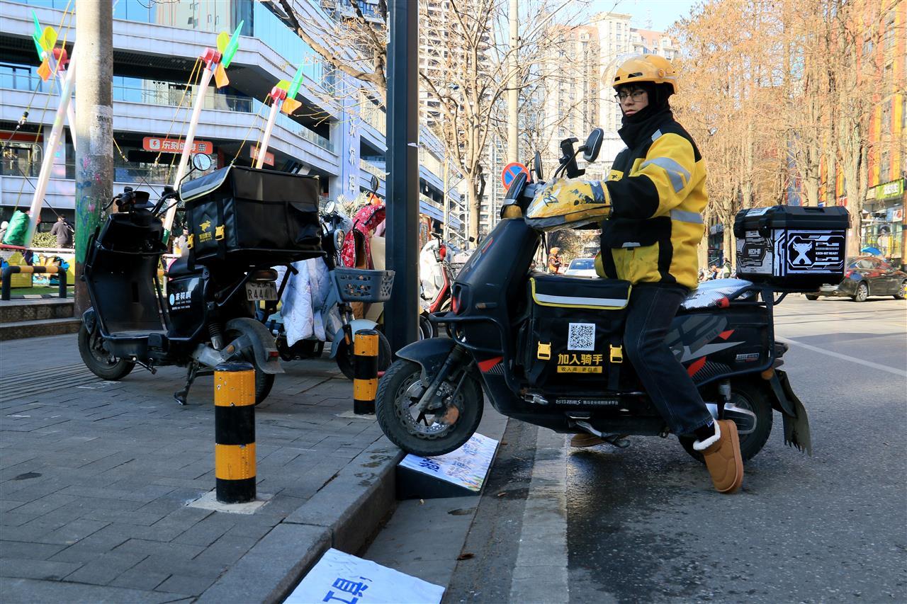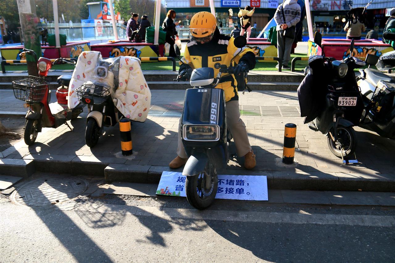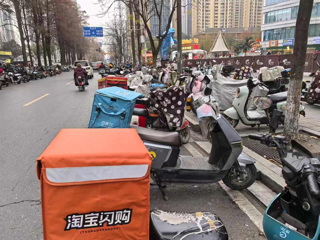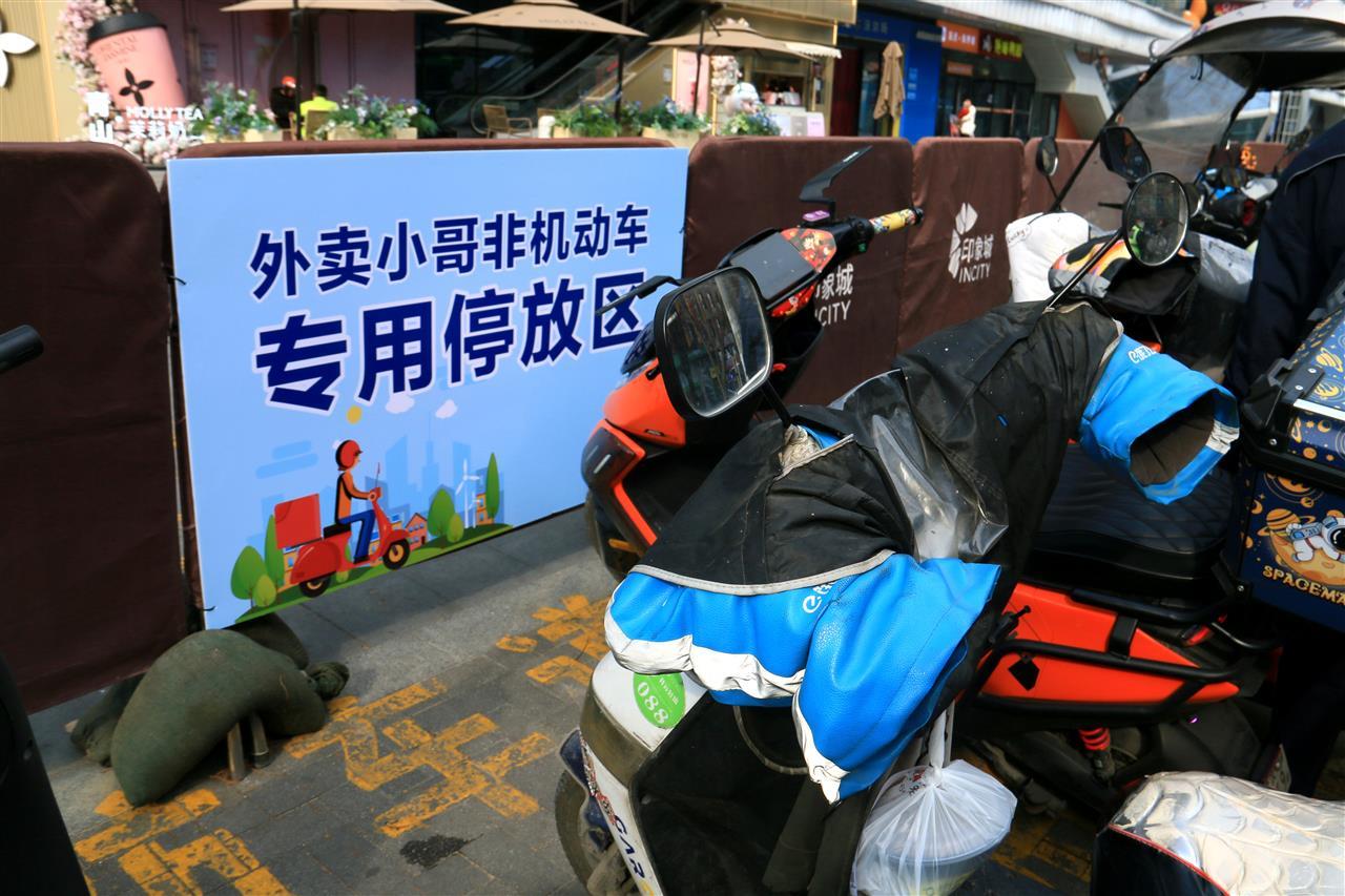 整治专班首先将外卖小哥的电动车由机动车道“请”上专用停车区,取缔占道停车乱象。极目新闻记者现场看到,印象城商圈门口设置了外卖小哥专用停车区(见下图)。这一停车区原来是商城200多名员工的电动车停放区,如今调整到和平大道停放,腾出的位置成为外卖小哥专用停车区,解决了随意占用机动车道的问题。