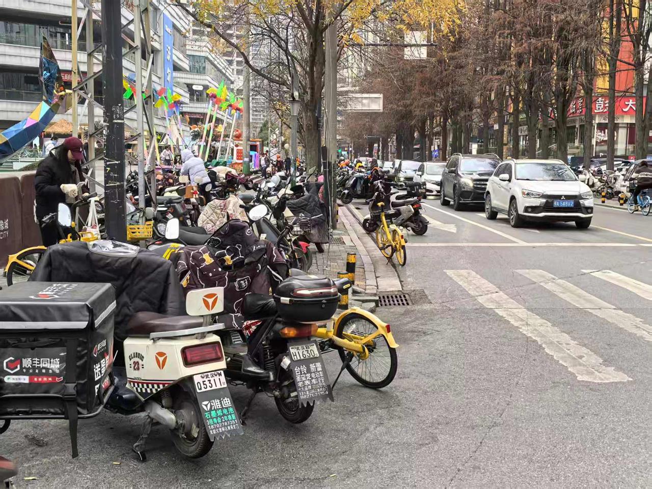 工业一路作为连接印象城商圈与居民区的核心路段,印象城商圈是青山区15分钟生活圈的核心之一,商圈人气居全市前十,而随着人气上涨,伴随的是人流车流物流同步上涨,给仅有三股机动车道的路段交通带来无限的压力,也给人民的出行和生活带来不便。高峰时节,非机动车、机动车(包括公交车)混行,拥堵不堪。最为突出的问题是外卖小哥将电动车横向停放(见下图),整整占据一股机动车道,让此处的拥堵状况雪上加霜,形成拥堵“重灾区”,成为市民群众反映强烈的民生痛点。