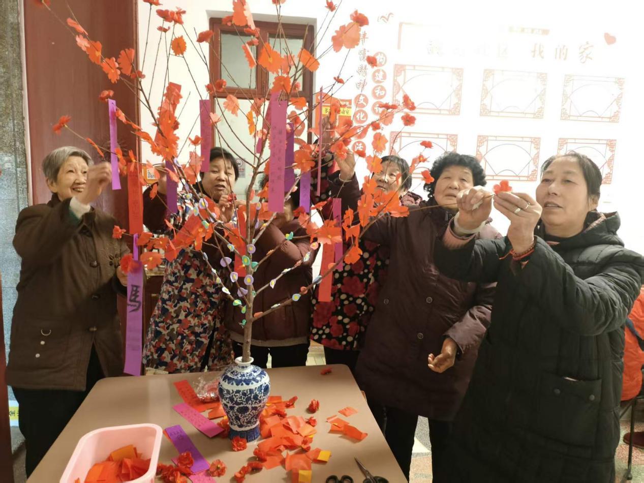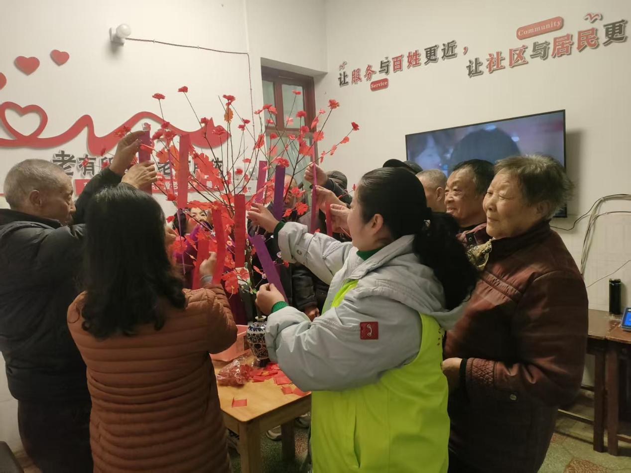 余婆婆捧着自己亲手制作的腊梅,眼角的皱纹里盛满笑意;汪爹爹在彩纸片上一笔一划写下真挚的祝福,“身体健康”“柿柿如意”“但求平安,一切顺遂”“辞旧岁,赴明媚……”字字句句皆是对生活的期许;陈爹爹则小心翼翼地将剪好的小花,一朵朵挂在树枝上,神情专注又温柔。这些作品或许称不上完美,却因倾注了满满的心意与专注,而变得熠熠生辉,成为独属于这个午后的动人藏品。