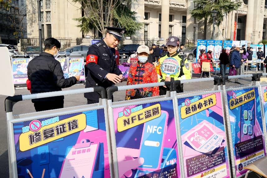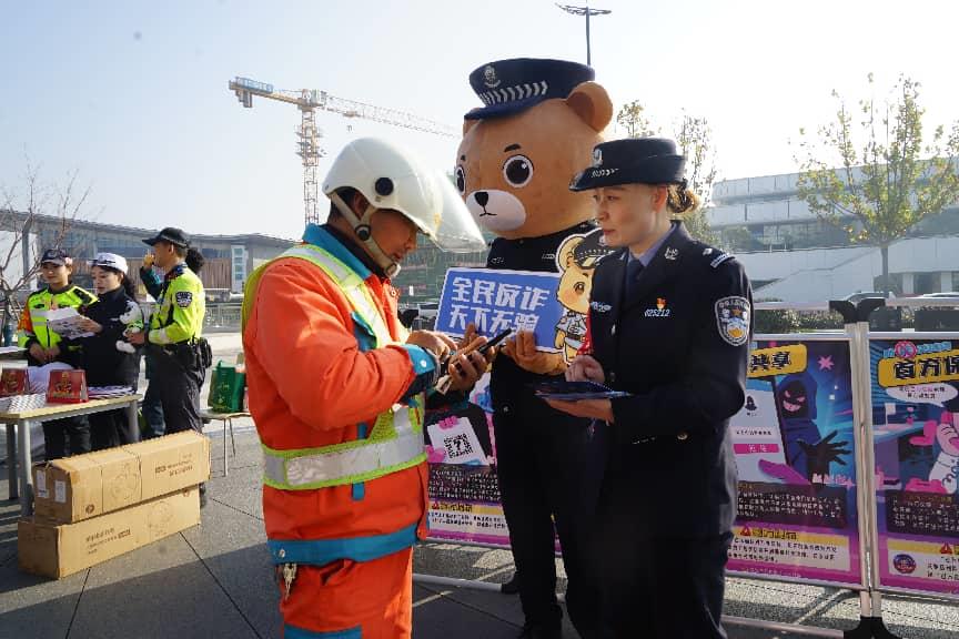 人群中,憨态可掬的“警察熊”人偶捧着“全民反诈,天下无骗”的宣传牌,不时与路人合影,在轻松气氛中传递着平安的理念。
