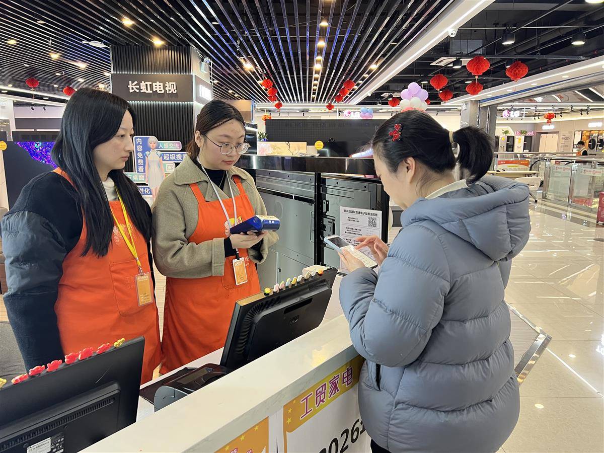 领取以旧换新补贴后,市民潘女士在收银台处买单。(湖北日报全媒记者 黄磊 实习生 张艺馨 摄)