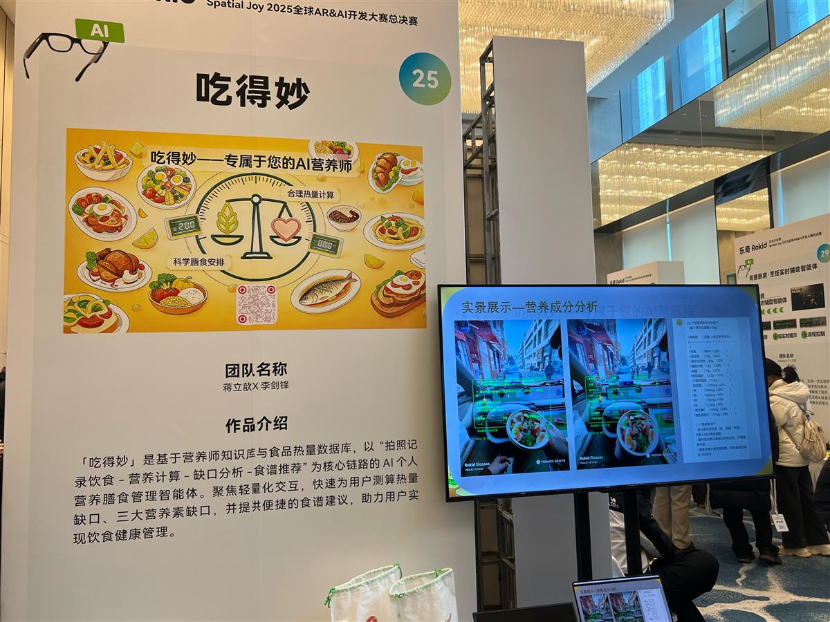 “吃得妙”被团队定位为“AI个人营养师”。只要用AR眼镜拍下一顿午餐,系统就能自动识别菜品并计算热量,同时给出三大营养素的摄入分析。现场一位体验者说:“以前想健康饮食,总觉得很复杂,现在戴上眼镜就能知道该怎么调整,这种感觉很直观。”