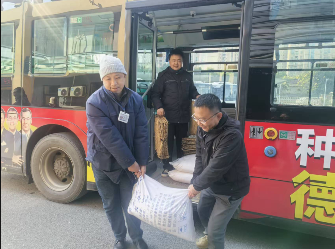 18日,在武汉中环商贸城公交枢纽站,706路工作人员搬运融雪剂和防滑草垫。通讯员供图