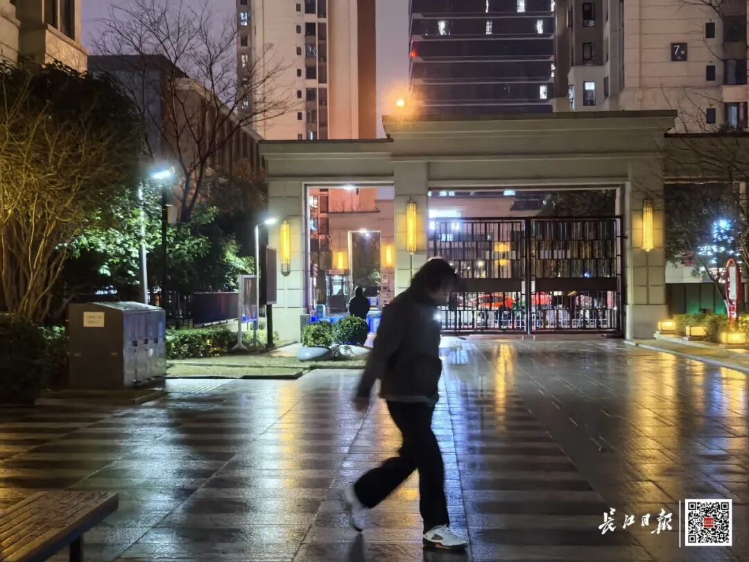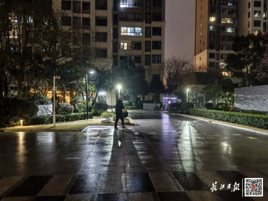 18日晚8时许,武汉市硚口区一小区内,行人在雨中行色匆匆。曹欣怡 摄