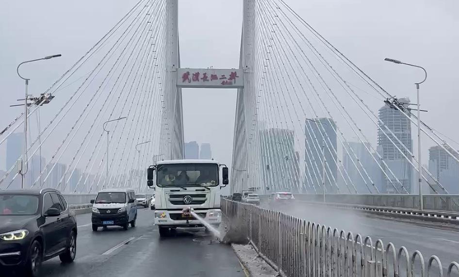 “液态融雪剂撒布车,在武汉还是首台。”武汉城投集团城运集团公司长江二桥运维片区副经理陈静辉说,前期公司试用效果不错,此次在长江二桥上进行首秀,看它实战效果。