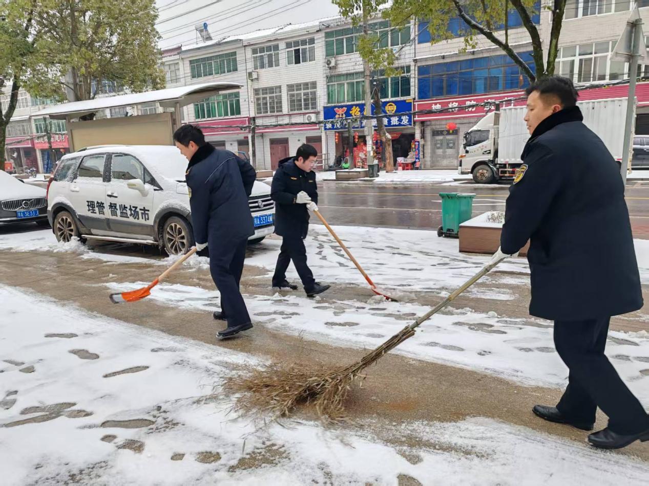 在集镇主干道、陡坡弯道等重点路段,执法队员们手持雪铲、扫帚,奋力做好除雪防滑工作。他们分工协作,有的破冰除雪,有的铺设防滑草垫,有的引导车辆缓行,主动帮助打滑车辆脱困。寒风凛冽,他们的身影在积雪映衬下格外醒目;冰雪湿滑,他们用实际行动为群众开辟“安全通道”。