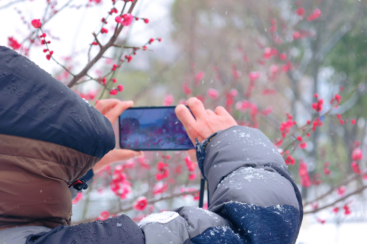 “我就住附近小区,每天都来公园遛弯。”市民张阿姨举着手机不断调整角度(见下图),镜头里的雪梅被定格成最美的风景。不远处,几位年轻姑娘穿着浅色外套,在梅树下相互拍照,笑声与雪花飘落的簌簌声交织在一起,非常富有生机和活力。