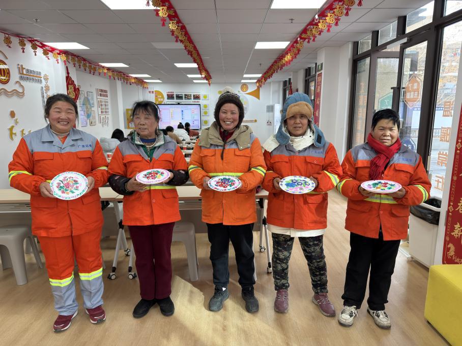 “石膏花盘真有趣,仿佛回到了无忧无虑的学生时代。”几名环卫工人向镜头展示着填涂好的花盘,脸上洋溢着灿烂的笑容。