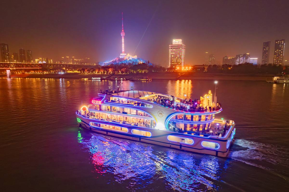 2月4日晚,武汉夜游标杆游船“长江荣耀”轮焕新回归长江夜景画卷。