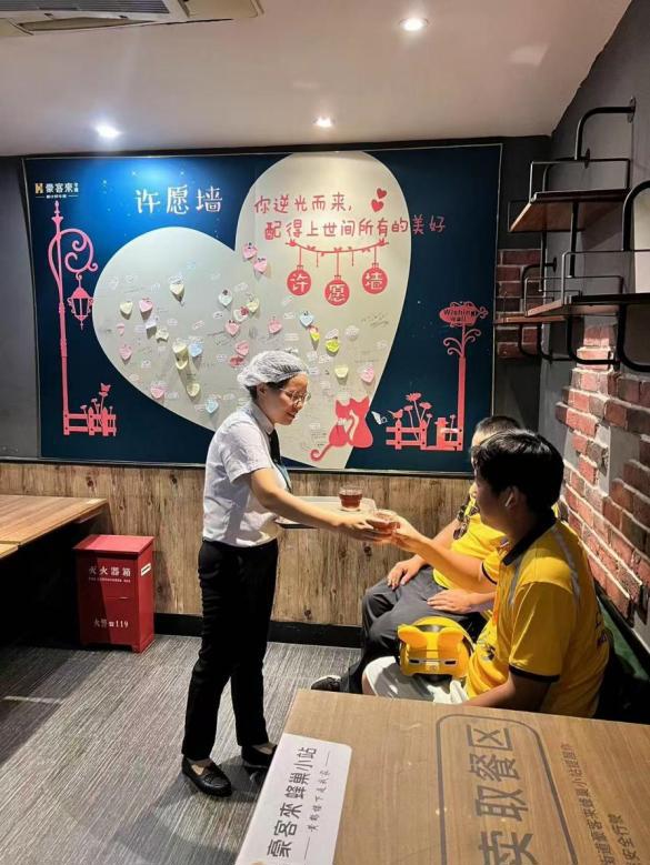 针对大成路人流量大、外卖骑手接单多、工作强度高的现状,多方协力提升街区友好度。部门联动疏堵结合。制作“友好地图”,在8个关键点位张贴,帮助骑手精准定位。协调城管、市场监管等部门增设10个临时停靠点与12个充换电设施,优化出行体验。商户接力关爱。推出每季度“流动红旗”,激励商户热情提供免排队取餐、免费热饮等服务,营造共同关爱新就业群体的浓厚氛围。2025年暑期,精武大包向彭刘杨社区“大成南极站”捐赠500杯绿豆汤和9000多瓶清凉饮品,受到广泛好评。