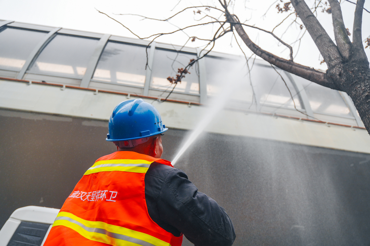 水枪绘“新颜”,街景更明亮。工作人员使用高压水枪,对隔音屏墙面附着污渍进行彻底冲刷,并对空调外机、窗沿等细节部位进行人工擦拭。为减少对市民出行的影响,作业采取分段、错峰方式进行,实现清洁效率与民生便利的双赢。