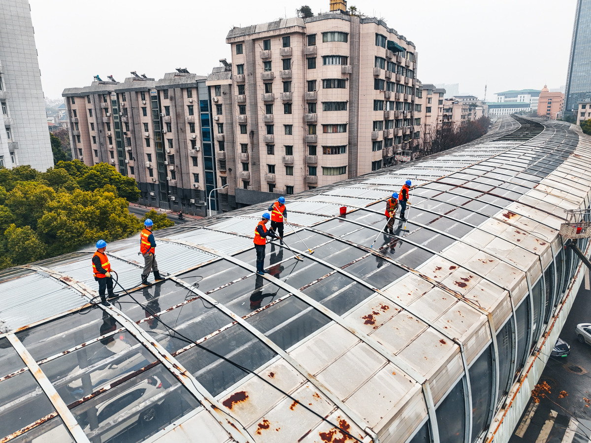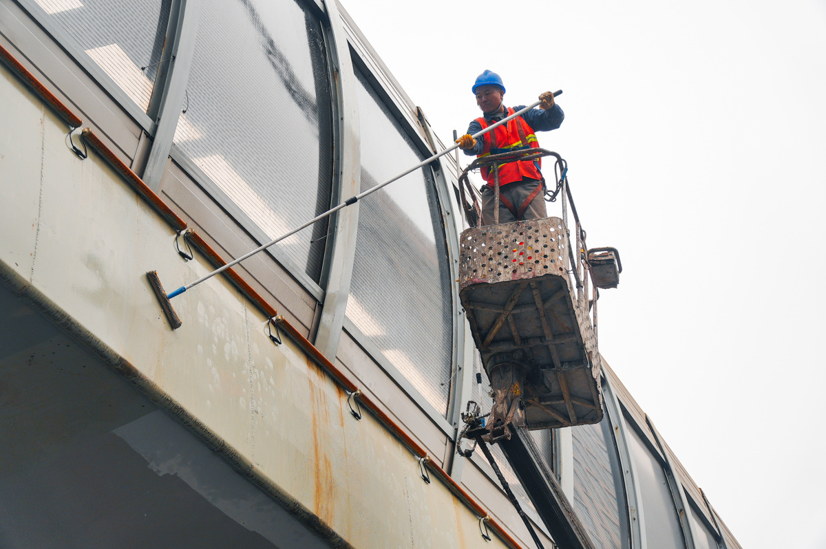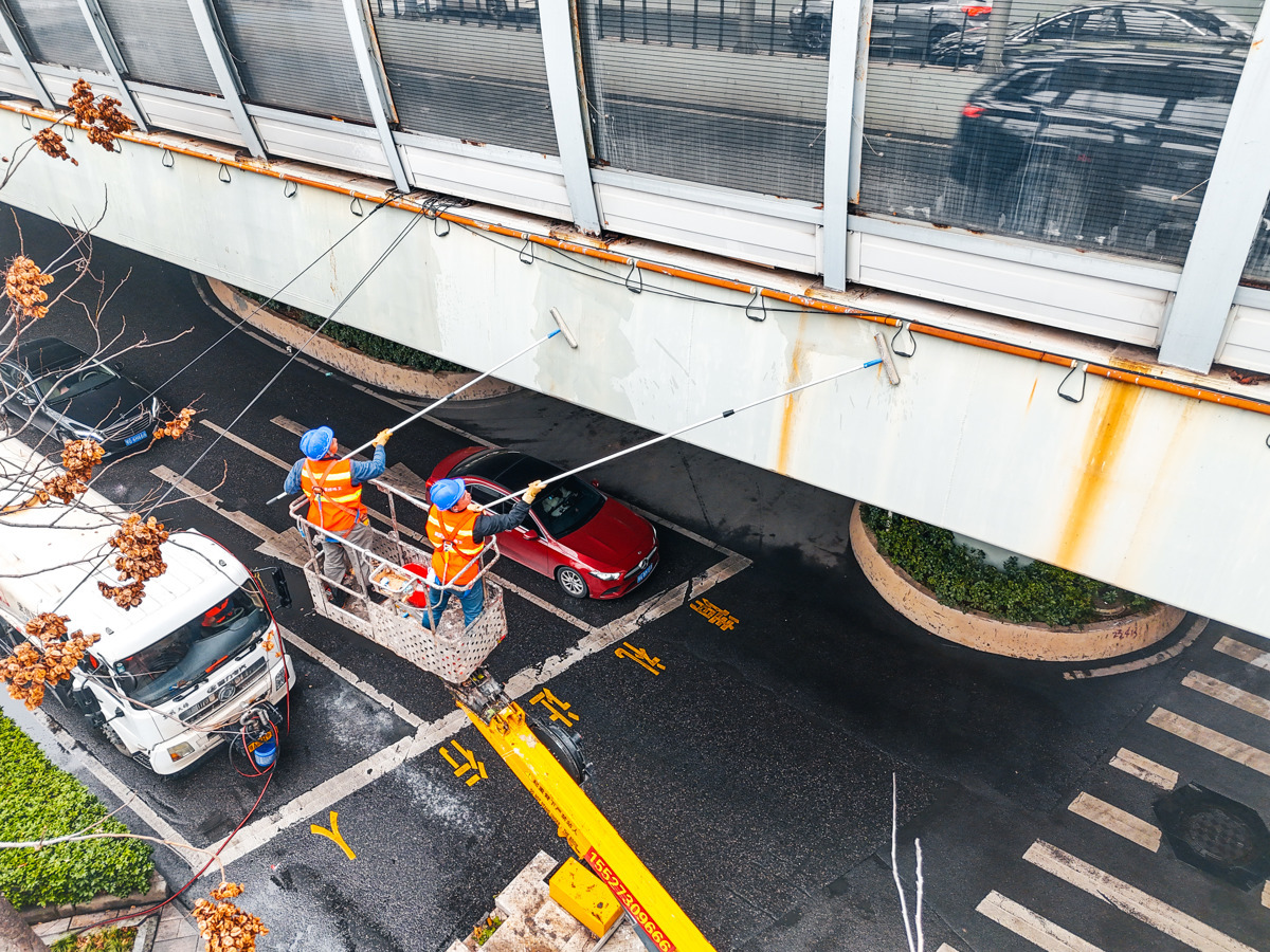 此次行动覆盖隔音屏顶部、立面及周边公共区域,采取“从上至下、由点到面”的作业流程,针对隔音屏顶部积存杂物、落叶等问题,作业人员配备安全绳等防护设备,化身城市“蜘蛛侠”,对屋顶开展全面清理。结合建筑结构特点,灵活采用人工清扫与机械辅助相结合的方式,彻底清除积尘与隐蔽垃圾,让屋顶面貌焕然一新。