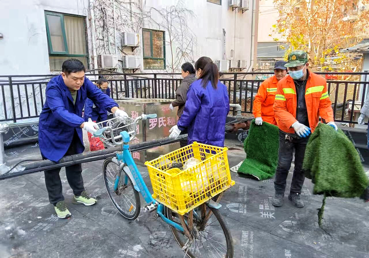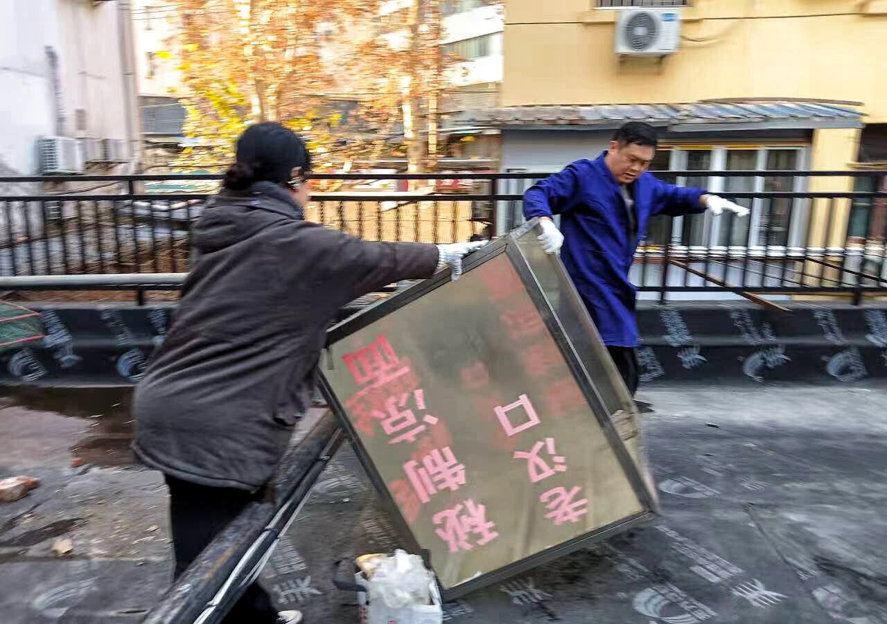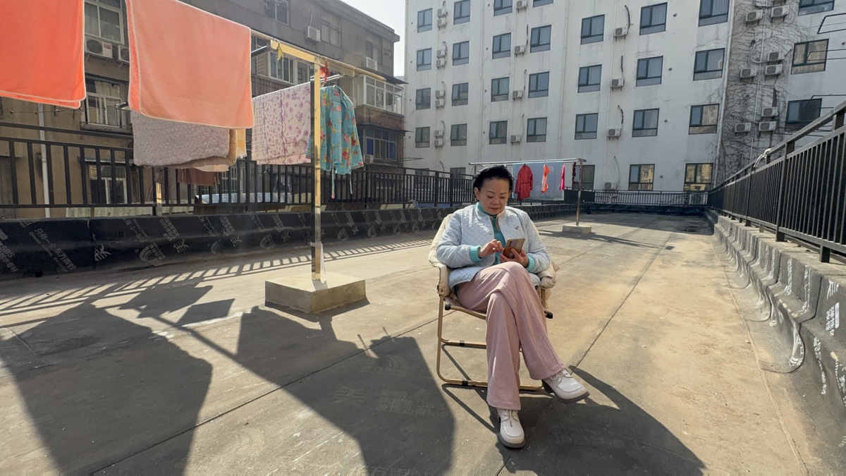 当天上午,硚口区宝丰二路宝地社区,街头巷尾的景致与前几天来此采访清理积存垃圾行动时不同,当初路边树枝、护栏、空中管线和健身器材上悬挂的、铺搭的腊鱼腊肉、衣服被褥不见了,小区“颜值”添色了不少。位于该路中段的24号区材保所宿舍院落,弯过几栋5层高密集的红砖色墙壁的宿舍楼,来到位于数楼环抱的院子中央的一栋平房前,从该平房的一侧楼梯拾级而上,来到楼顶,映入眼帘的是干净平坦的近300平方米楼顶露台上,数十根新设置的晾晒架布满露台中央,晾晒架上晒着被褥、衣服和腊鱼腊肉等,与露台上几位躺在躺椅上刷抖音、看书的居民一起,沐浴着冬日的暖阳。