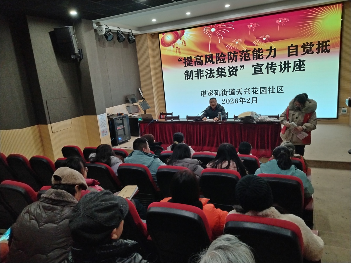 为进一步提升社区居民金融风险防范意识,有效遏制非法集资活动在社区滋生蔓延,切实守护居民“钱袋子”安全,2月9日下午,武汉长江新区天兴花园社区举办“提高风险防范能力、自觉抵制非法集资”主题宣传讲座。本次讲座由社区联合辖区派出所,吸引了近百名居民到场参与。