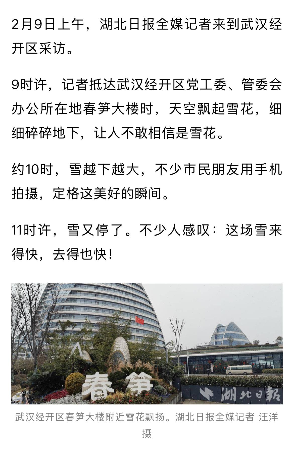 9时许,记者抵达武汉经开区党工委、管委会办公所在地春笋大楼时,天空飘起雪花,细细碎碎地下,让人不敢相信是雪花。同时间段,在武昌开车的湖北日报全媒记者,在友谊大道附近也拍到了漫天的雪花。