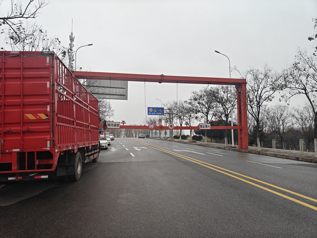 2月9日下午,极目新闻记者驱车前往汉江堤实地探访。在慈惠街与九通路路口,此前往汉江堤方向设置的限行卡口已被拆除,可驾车直接上堤,但路口仍设有一座红色限高架,限高2米,以管控大车、载重车辆上堤。