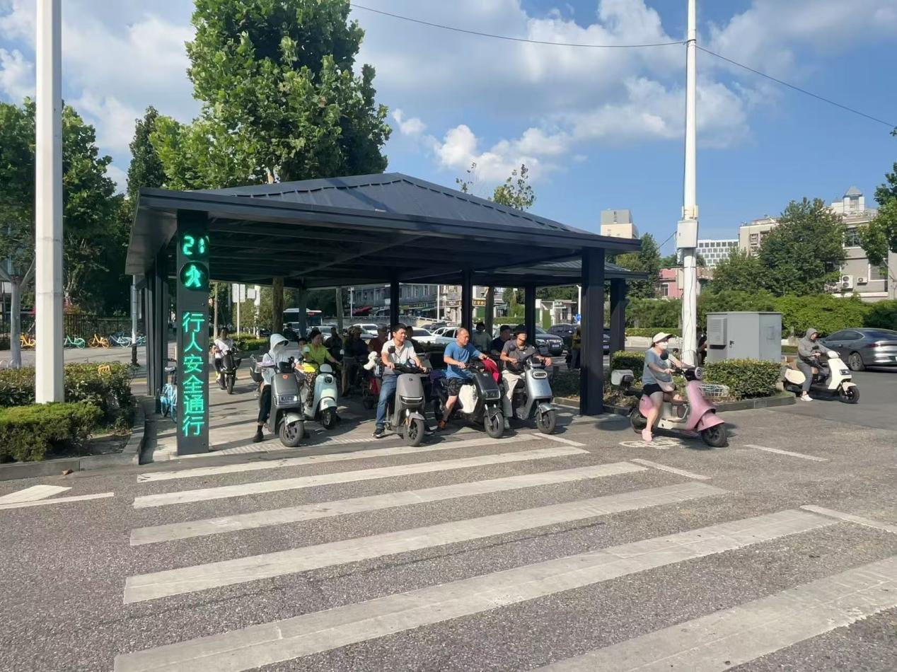 当安全得到坚实保障,治理的精度便自然投向更细腻的出行体验。在武昌楚汉路杏林西路口,紧邻医院、商圈,非机动车流量高达4527辆/小时,群众在日晒雨淋中苦等红灯的困境被纳入治理视野。武昌交警不仅优化了通行空间,更将目光投向了等候的舒适度。通过协调搭建轻钢结构遮阳棚,集成信号灯与宣传屏,让市民在恶劣天气中有了一个安心的驻足处。这项充满温度的设计,让夏季候车体感温度显著降低。“这棚子接地气!雨天不淋雨,晴天也晒不着。”带孙子看病的刘爹爹的称赞,让这项改造的意义超越了通行本身。