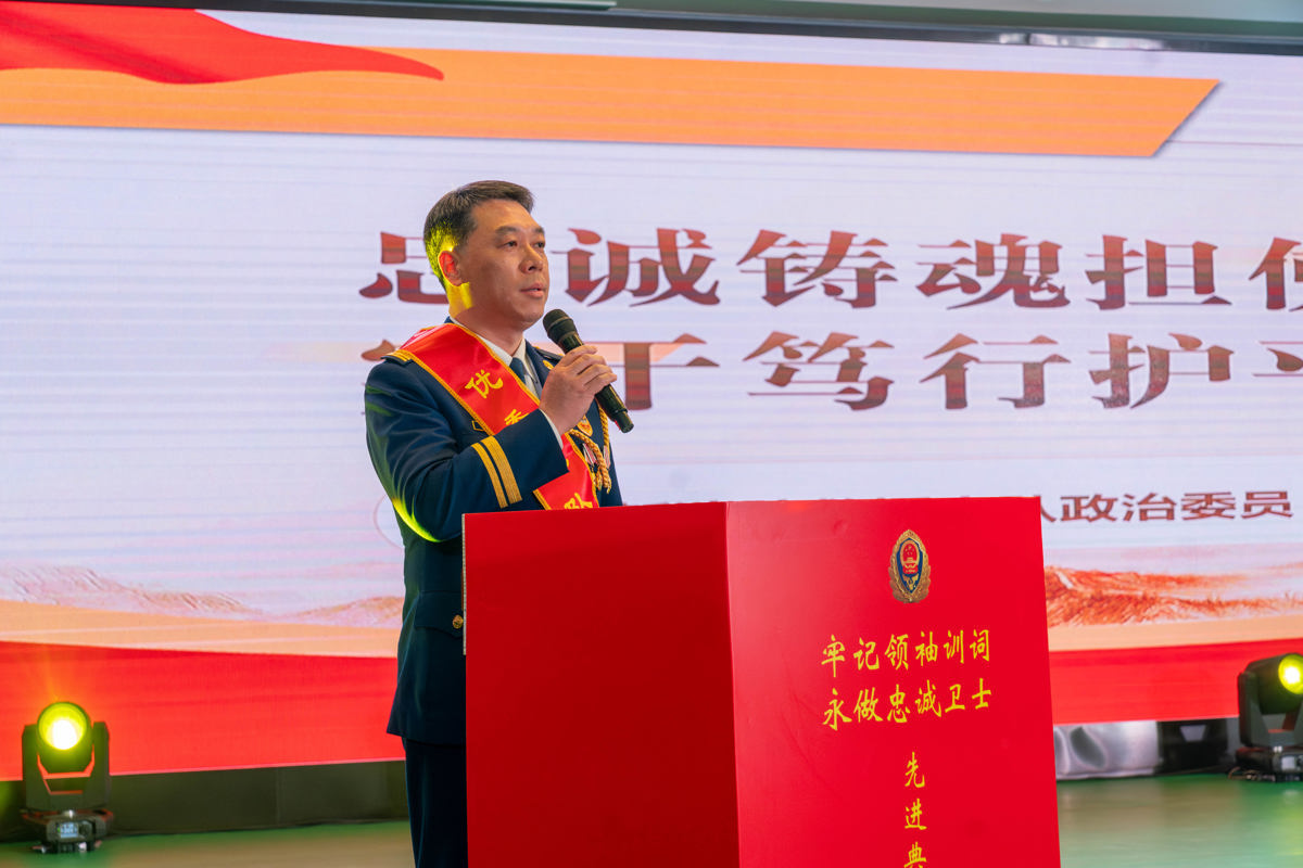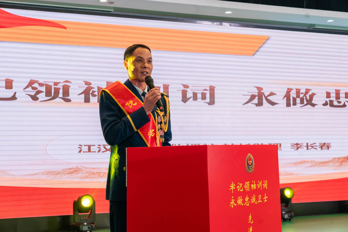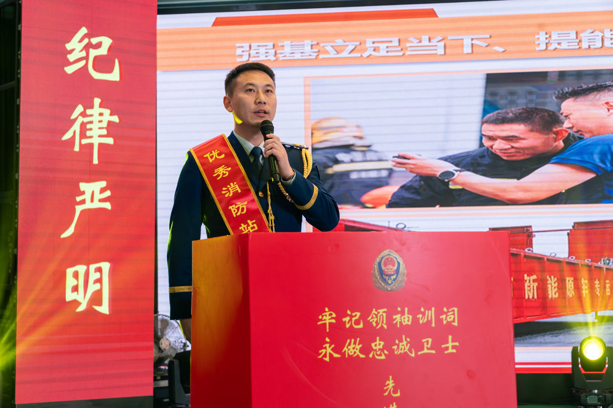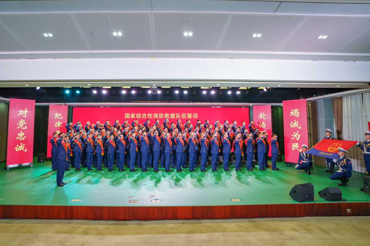 随后,全体指战员面向队旗,在“全国应急管理系统先进工作者”“全国优秀人民警察”“全国消防部队优秀共产党员”李长春同志带领下,庄严重温入队誓词。铿锵有力的誓言响彻会场,彰显的是武汉市全体消防救援人员为人民平安赴汤蹈火的坚定信念,也是对初心使命的郑重践行。
