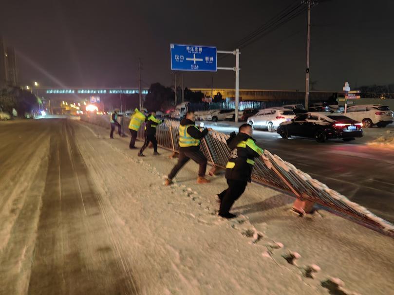 “前方路面结冰,减速慢行,保持安全车距!”交警的喊话声穿透风雪,不断提醒过往车辆;快骑队员在车流中往返穿梭,发现车辆打滑、停滞等情况,立即上前帮扶安装防滑链、牵引车辆,全程忙而不乱。