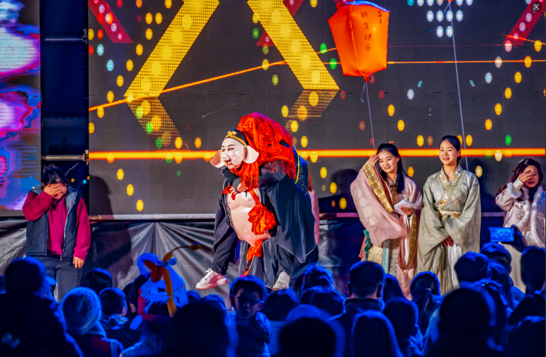 广场中央的舞台前围得水泄不通,身着古装的演员长袖翩跹,不时与台下观众互动。猜灯谜、投壶的摊位前排起长龙,穿甲胄的“将军”为游客递上箭支,一袭汉服的“仙子”轻摇团扇提示谜底。