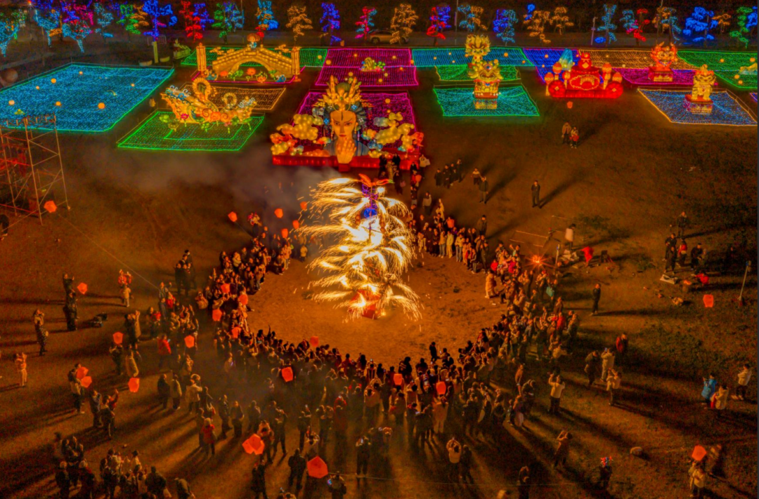 表演结束,广场中央燃起篝火,游客手拉手围成圈跳舞。篝火旁,近百盏写满心愿的孔明灯同时升起,孩子画了匹小马,老人写下“全家平安”。“愿新年,胜旧年。”李先生牵着妻子和女儿,目送灯火升起。