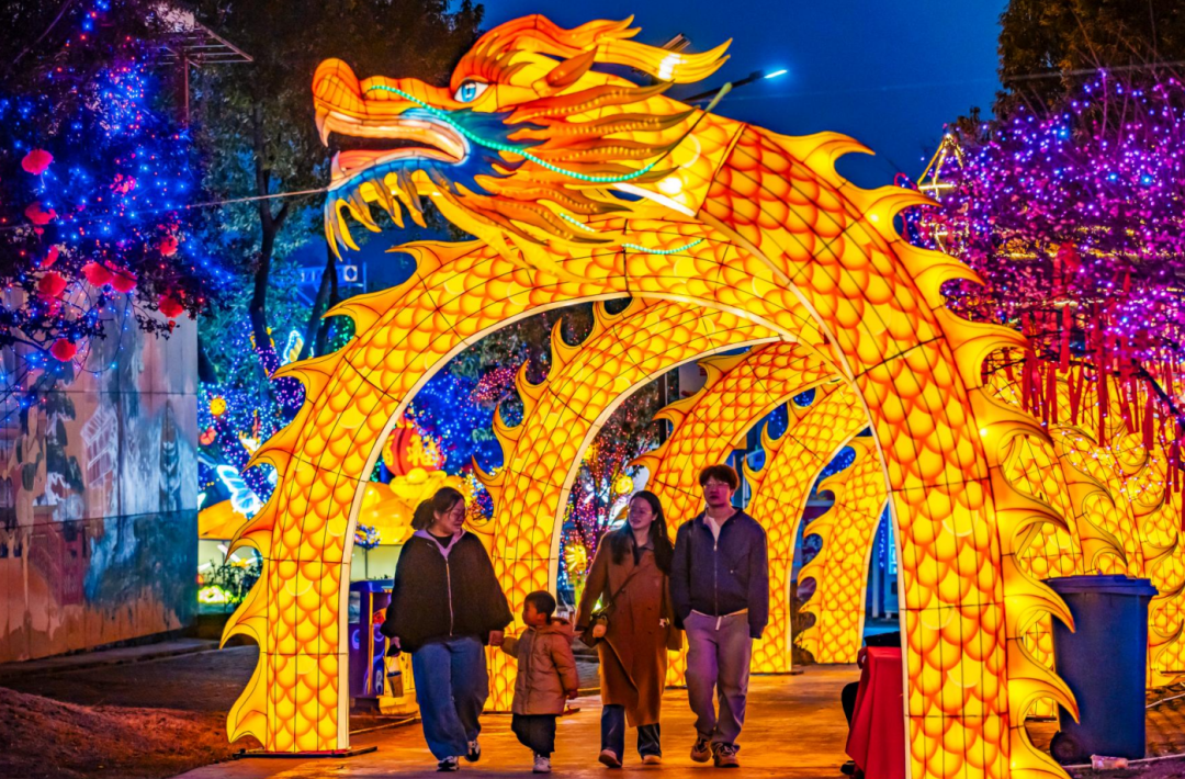 一进大门,荷花龙鱼灯就抓住眼球,龙首鱼身、口衔莲花,活灵活现。再往里,十二生肖送福灯排成一列,小猪拱手、小猴作揖,孩子们挨个合影。穿过金龙送财花灯就能听见舞台区的音乐,金色巨龙口衔元宝,游客争相触摸龙头,图个“新年发大财”。
