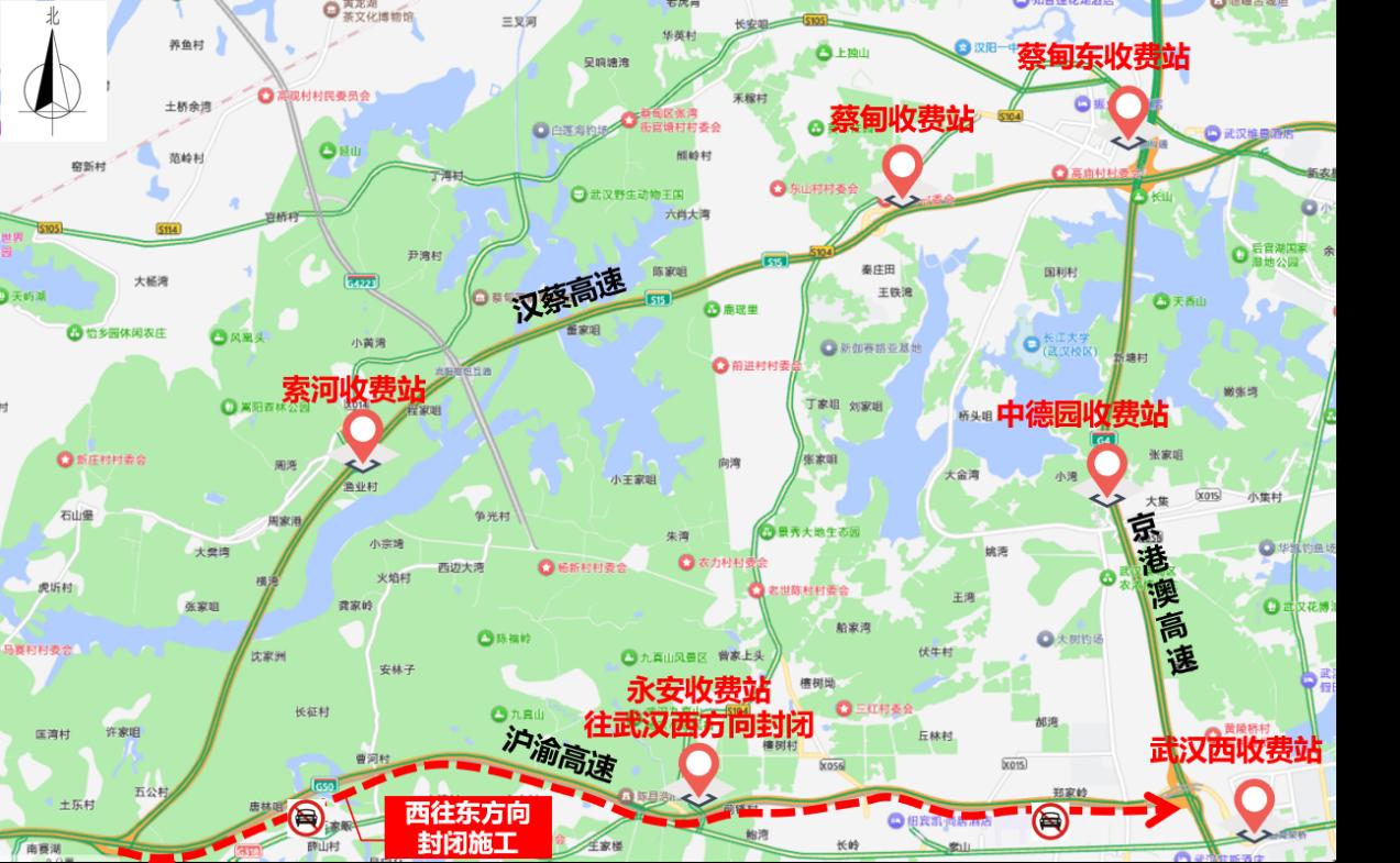 沪渝高速西往东(汉蔡高速往京港澳高速武汉西收费站)方向封闭施工,仙桃往武汉市区方向禁止车辆通行。