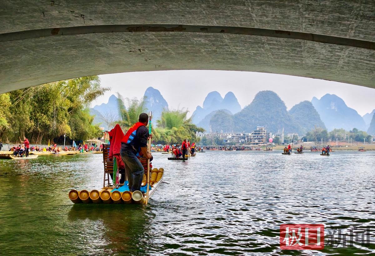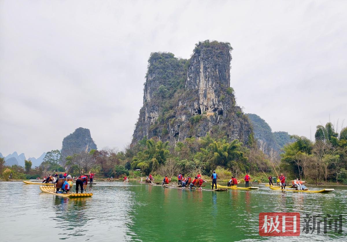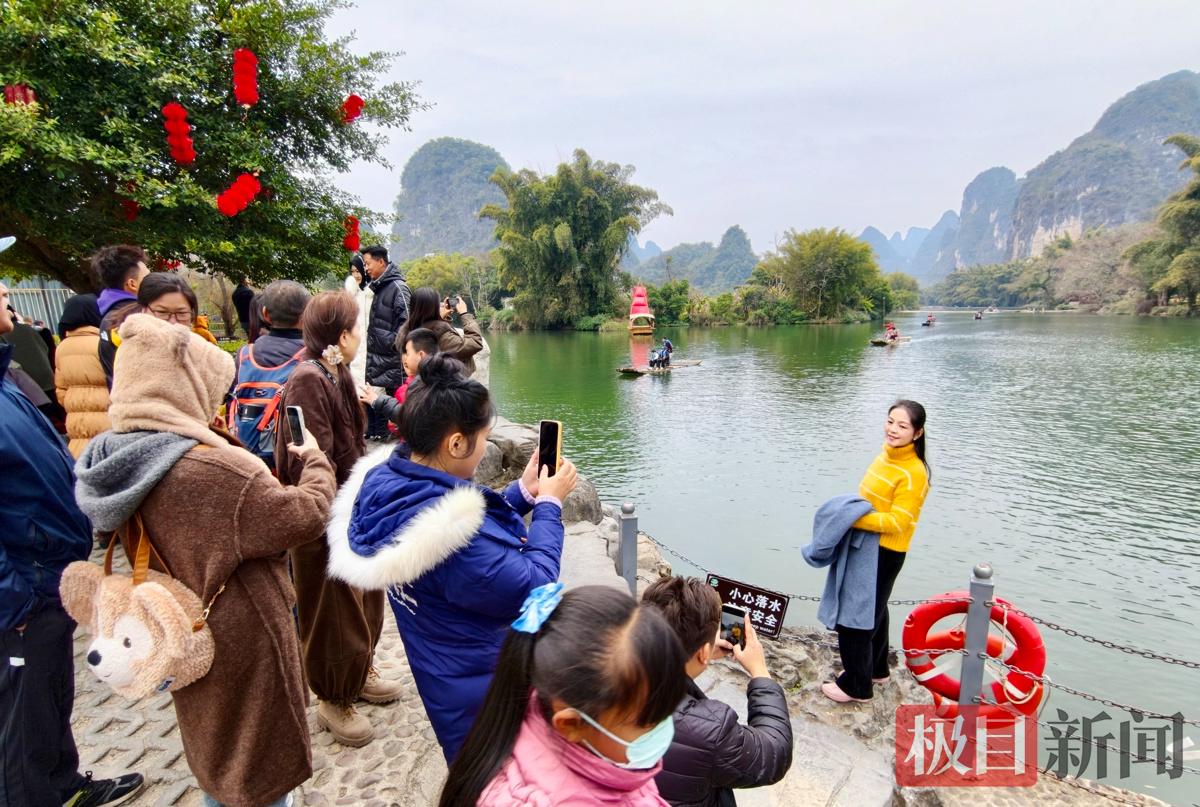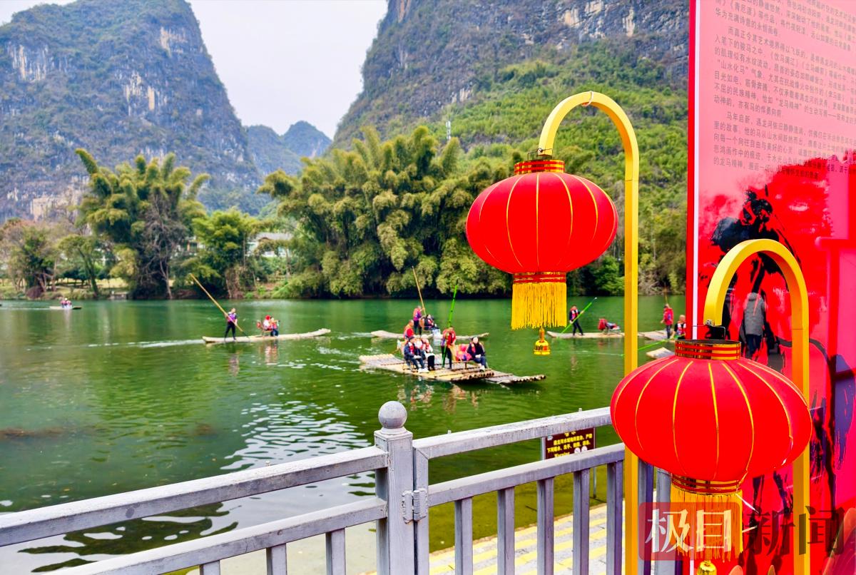 春节假期,广西桂林阳朔十里画廊景区迎来客流高峰,各地游客纷至沓来,徜徉于喀斯特山水之间,乘竹筏、赏美景、玩低空飞行,在如画风光里欢度新春佳节。