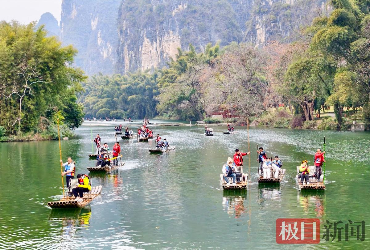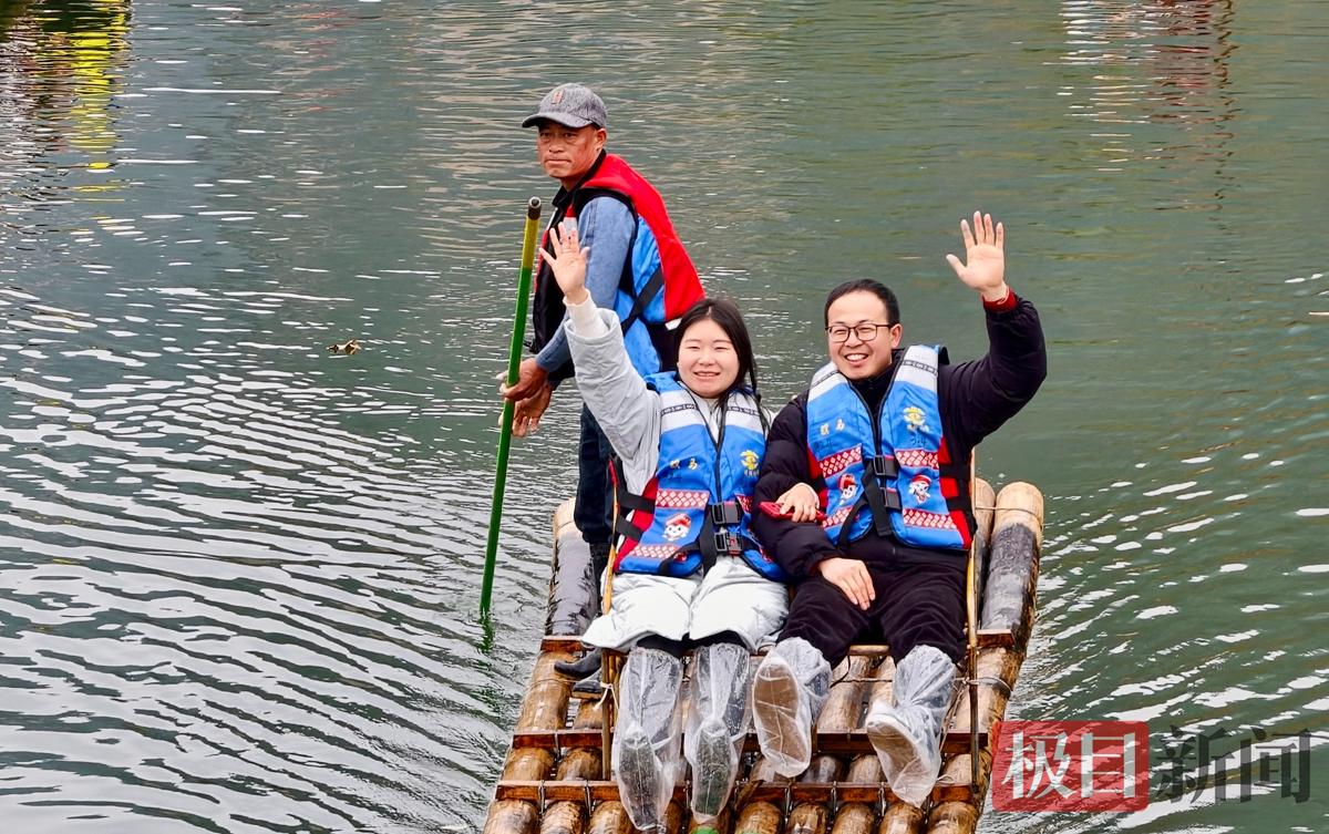 2月17日,极目新闻记者现场看到,十里画廊峰林耸立,田园阡陌交错,遇龙河如碧玉丝带般穿境而过。清澈河面上,人工撑篙竹筏缓缓前行,筏工轻点竹篙,碧波荡漾,两岸青山倒影入水,古桥、翠竹、村落相映成趣,游客置身其中,尽享“舟行碧波上,人在画中游”的诗意意境。