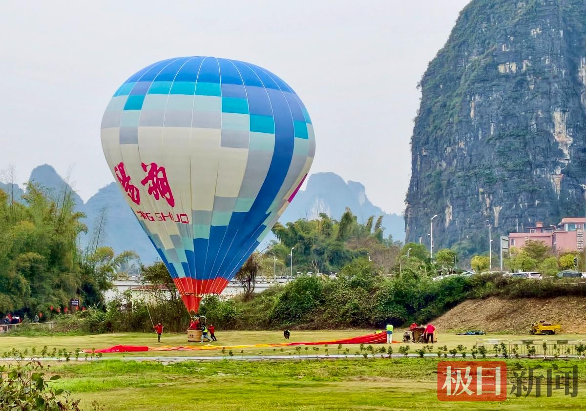 水上悠然,空中惊险。景区内的滑翔翼、热气球等项目备受年轻游客追捧。滑翔翼乘风而起,穿梭于峰林之间,将十里画廊的绝美风光一览无余;热气球缓缓升空,游客从云端俯瞰,遇龙河蜿蜒流淌,田园峰林尽收眼底,独特的视角成为新春打卡热门。