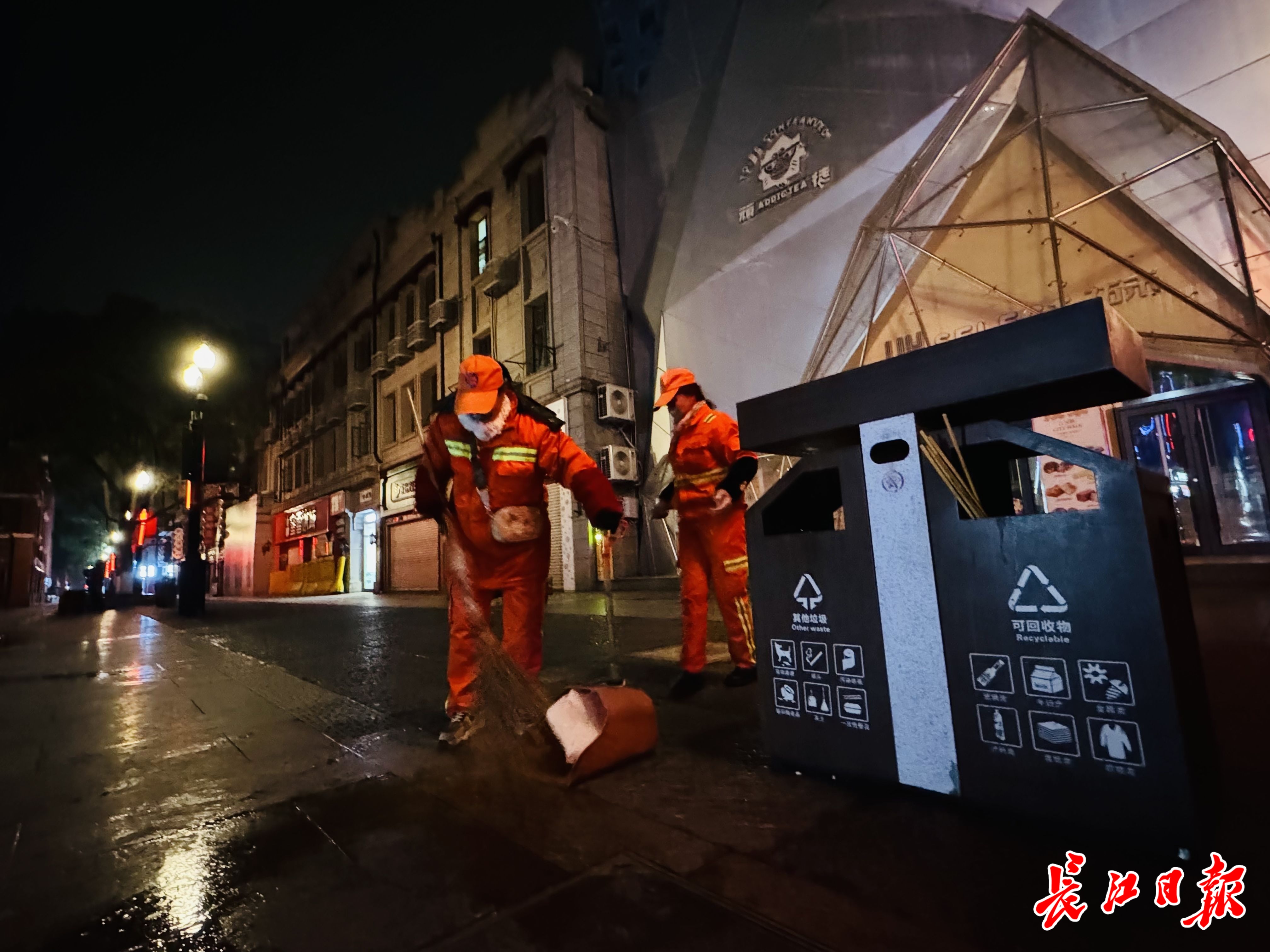 “新年好!”一声热情的问候打破了凌晨的寂静。江汉路环卫班长张秀芹遇见同事李艳琴,亲切地打过招呼后,便迅速投入到工作中。当清扫至鄱阳街路口时,两人停下了脚步。“由于鄱阳街有夜市摊点深夜12点后仍在营业,因此我们在晨扫时会特别留意此处的垃圾情况。”张秀芹一边说着一边和李艳琴一起将商户放置在垃圾箱旁的垃圾打包,等待清运车的到来。