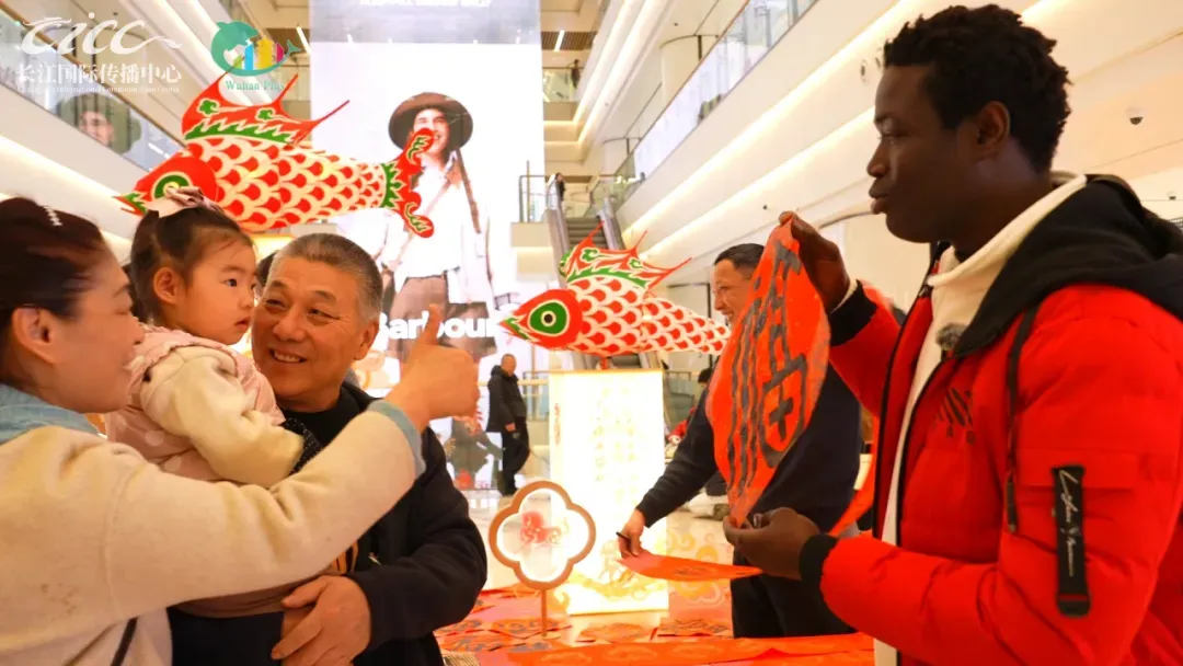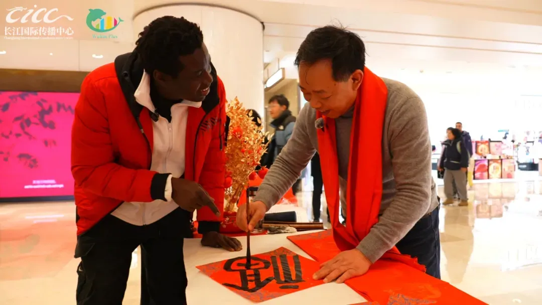 集市上,中国书法家协会会员、武汉书法家协会副主席褚群杰正凝神运笔。郭飞龙上前用略带生硬但热情的中文说:“老师您好!我想学写‘福’字!”
