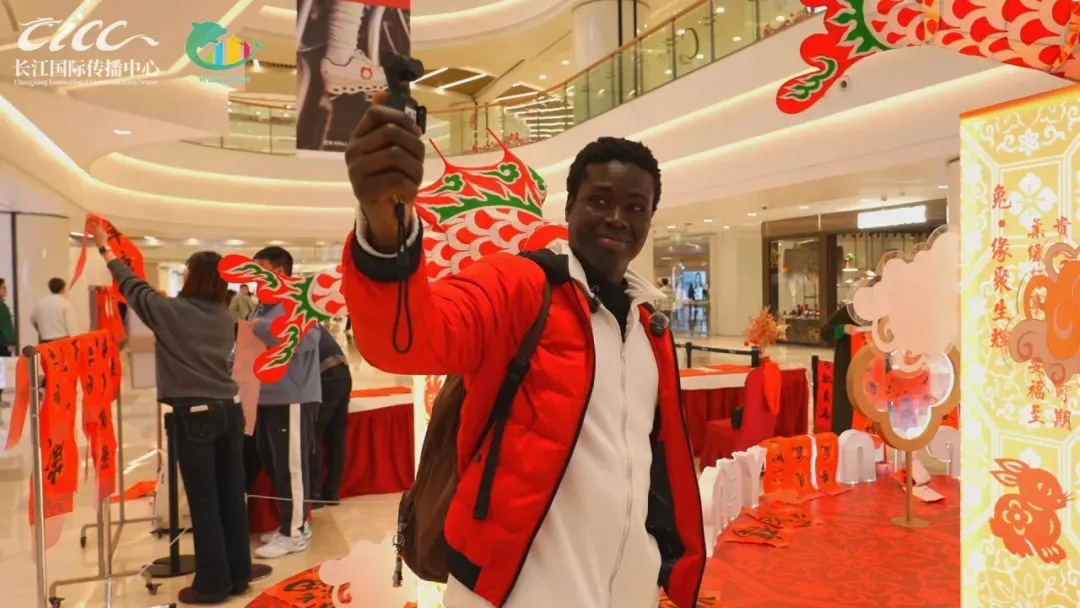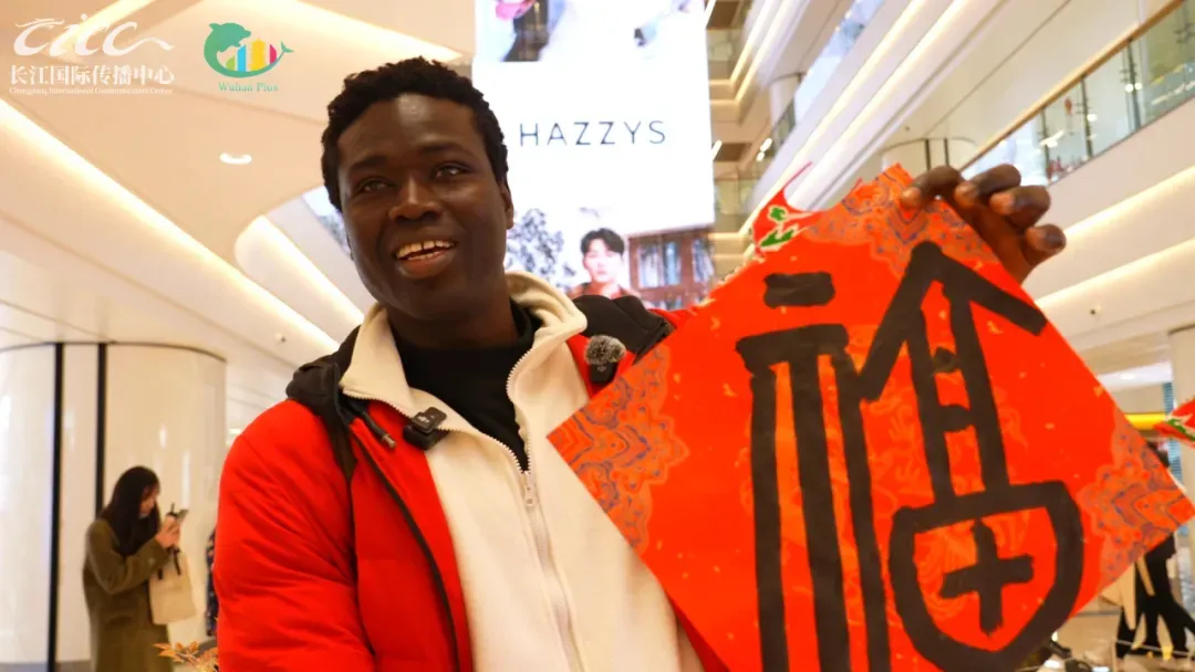 2026年春节的武商MALL门口,这位塞内加尔小伙对着手机镜头开心自拍,背景是热闹非凡的春节非遗集市,马年的红色装饰点缀着每个角落,新年的气息扑面而来。他的任务卡上写着三项挑战:解锁非遗技能·书法、亲手写“福”、传递新春祝福。带着这份“使命”,郭飞龙走进了人潮涌动的非遗集市。