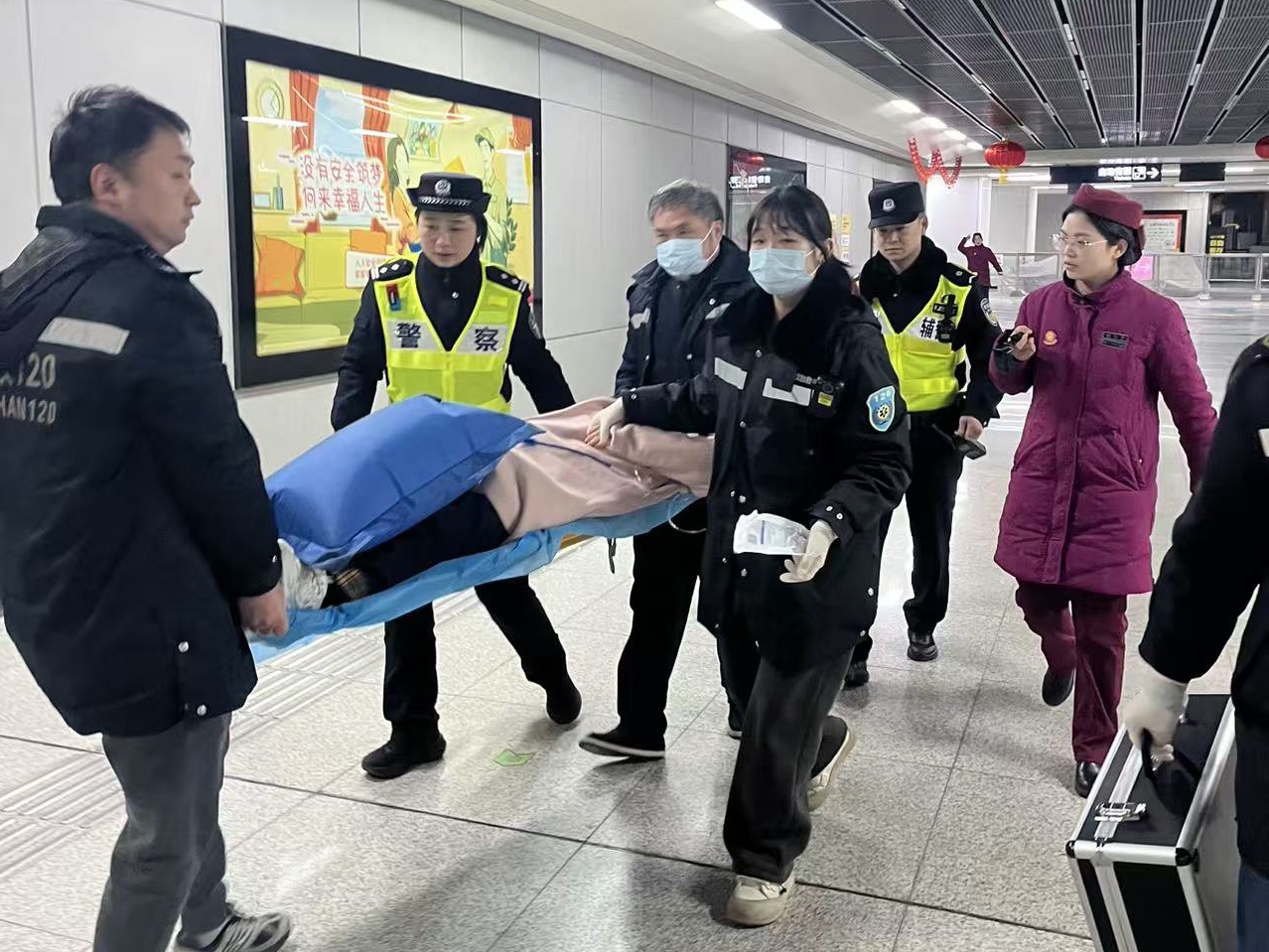 孔涛将情况报告给民警张晶。民警辅警迅速携带医疗箱和轮椅赶到现场,同时联动地铁工作人员到场协助。现场,民警辅警和地铁工作人员分工协作,维护现场秩序,疏散围观群众,展开紧急救助。