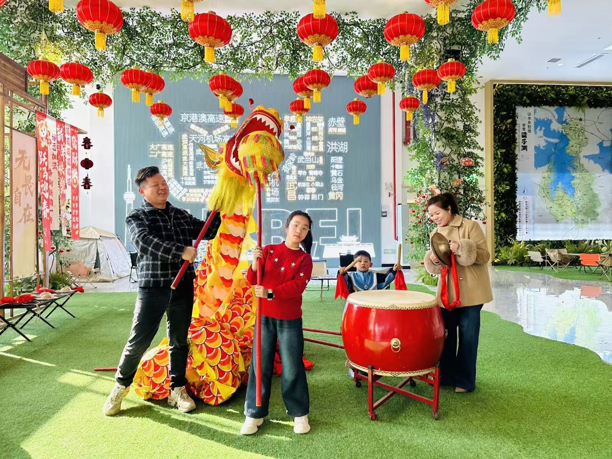 在“营地小厨”餐厅,番茄炒蛋、红烧土豆等家常菜现炒现卖,张先生一家在此用餐。饭后,服务区“锣鼓喧天”互动区提供锣鼓供旅客敲击体验,张先生夫妇与孩子参与其中。餐厅旁的“荆楚年味集”设有非遗剪纸摊位,孩子在此剪出“马年福字”,张先生夫妇则选购了荆楚腊味和福袋。
