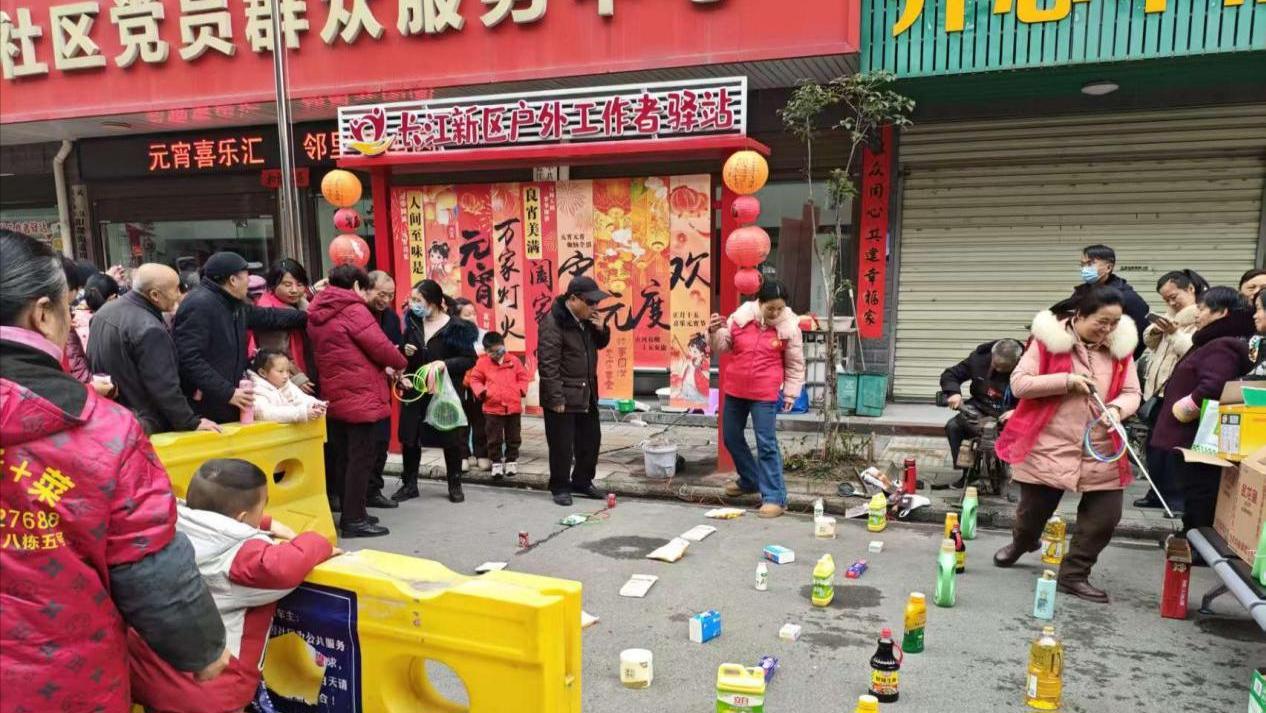 最受欢迎的是趣味游戏区,除了非遗拓印、拔河、汤圆大搜索、投元宵,还有趣味套圈,活动现场不时爆发出阵阵喝彩与欢笑声,参与者的脸上都洋溢着纯粹的快乐。
