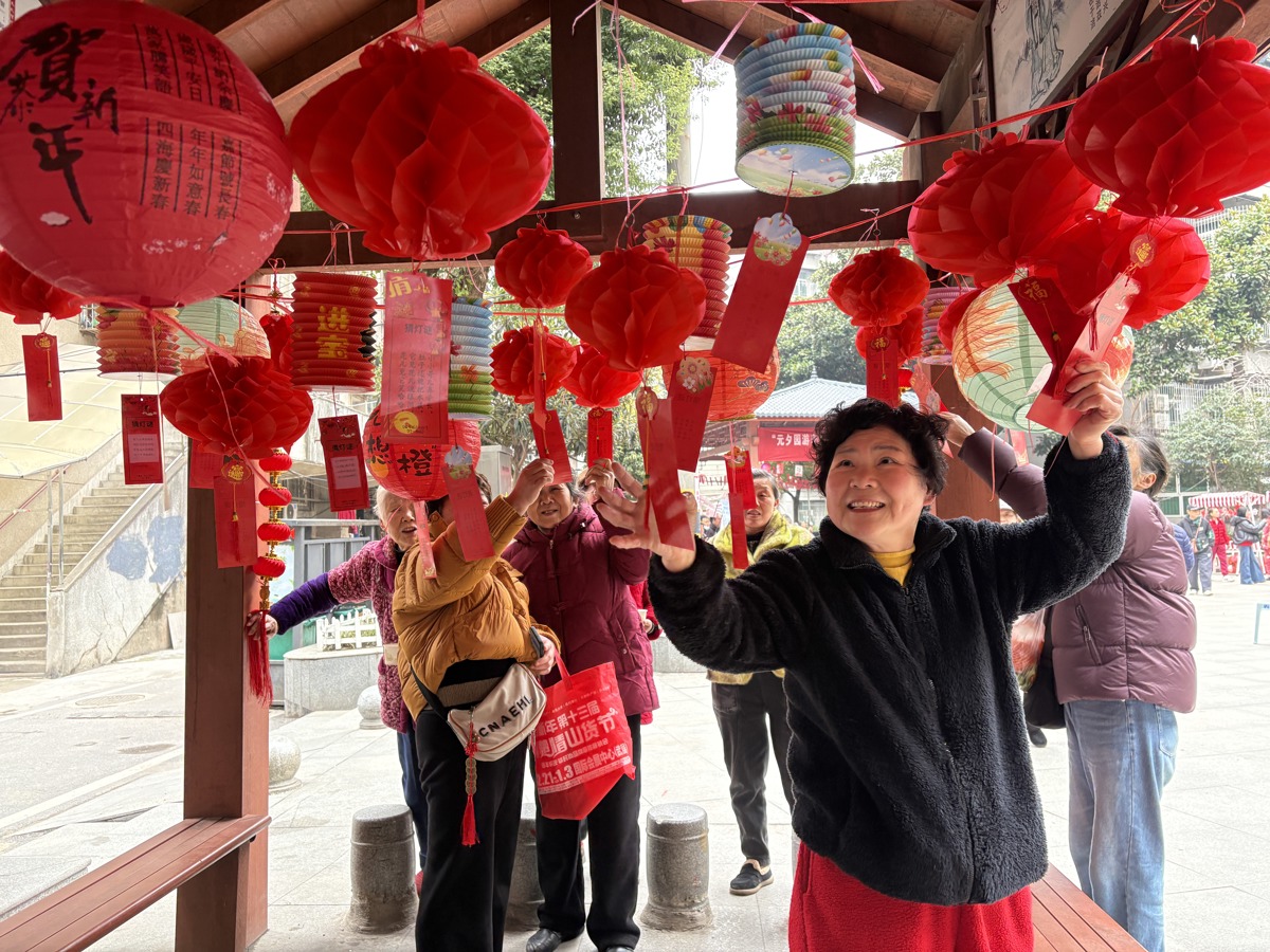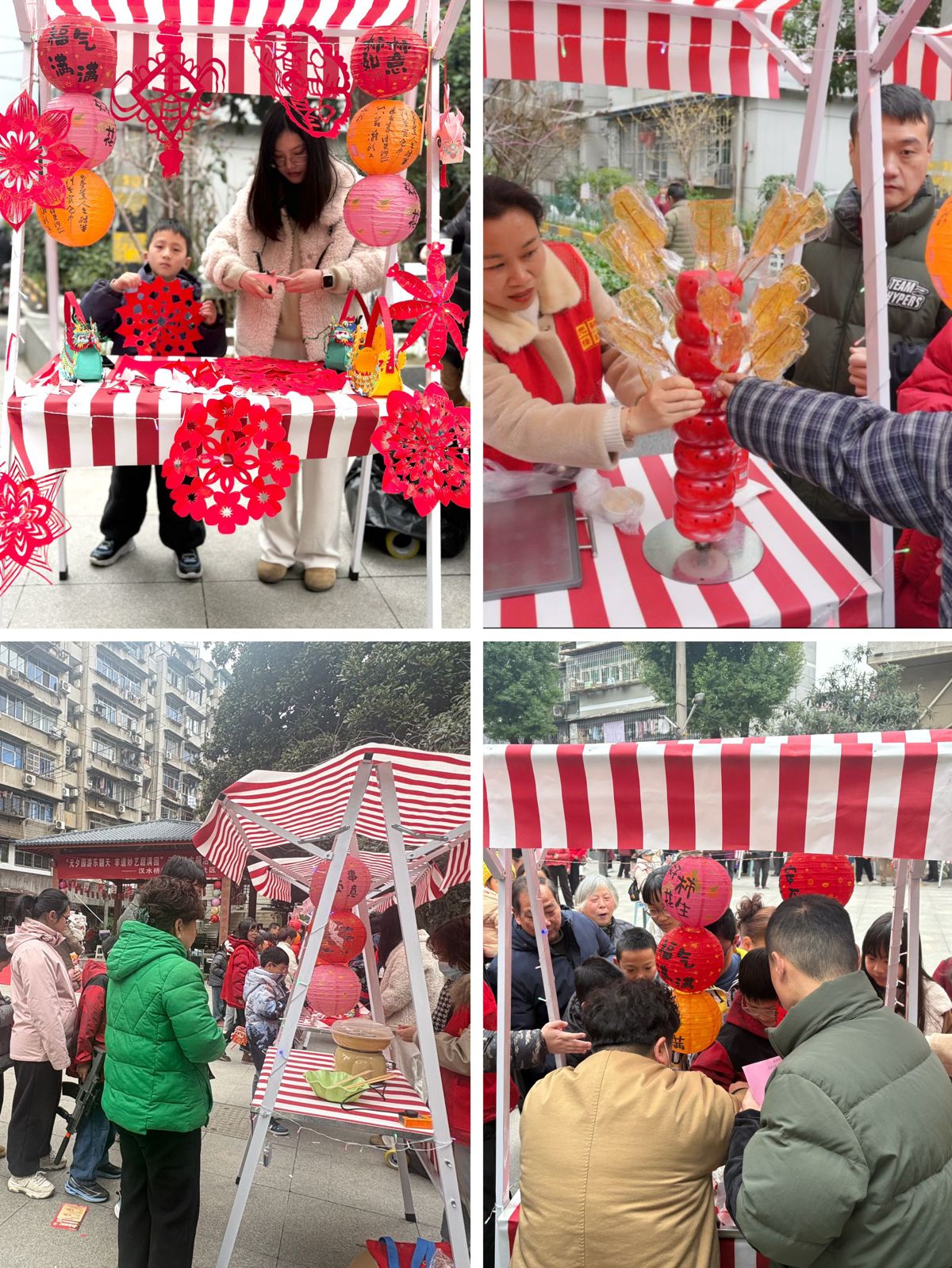 舞台旁的花车集市同样热闹非凡。窗花剪纸、棉花糖、糖葫芦、糖画四大特色摊位前人头攒动,成为孩子们的“欢乐天地”和大人们的“回忆杀”。棉花糖摊位前,一团团雪白的糖丝飞速旋转,转瞬变成蓬松的“云朵”;糖葫芦摊位上,各式水果裹着晶莹的糖衣,酸甜诱人;糖画摊前,小马驹、兔儿爷等传统造型跃然纸上,机器人、大房子等新型造型映入眼帘,引得孩子们纷纷围观;窗花剪纸摊位前,红纸在剪刀下流转,一幅幅寓意吉祥的窗花很快成型,居民们争相领取,将新春的美好祝福带回家。活动现场设有猜灯谜等传统游戏,更将节日氛围推向高潮。