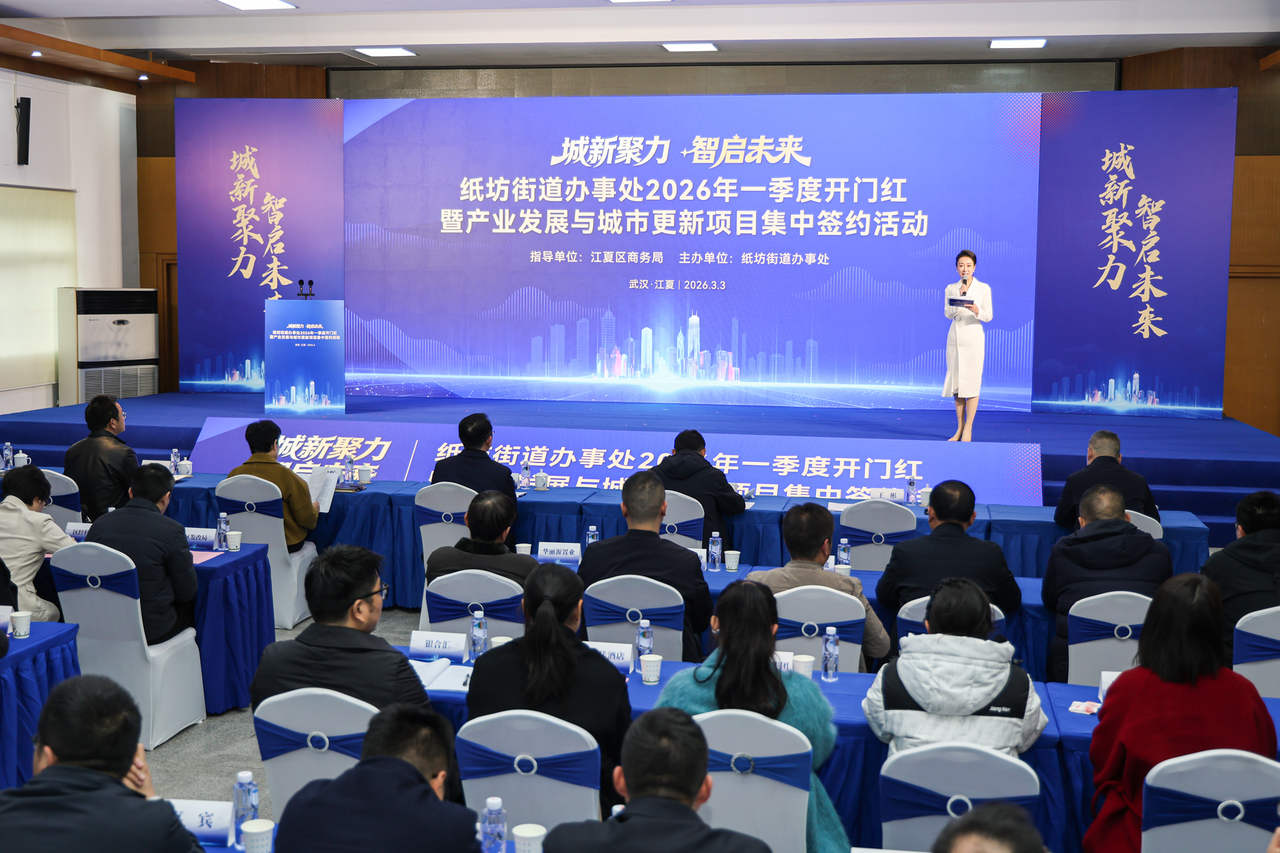 3月3日,武汉江夏区纸坊街道举行一季度开门红暨产业发展与城市更新项目集中签约活动。