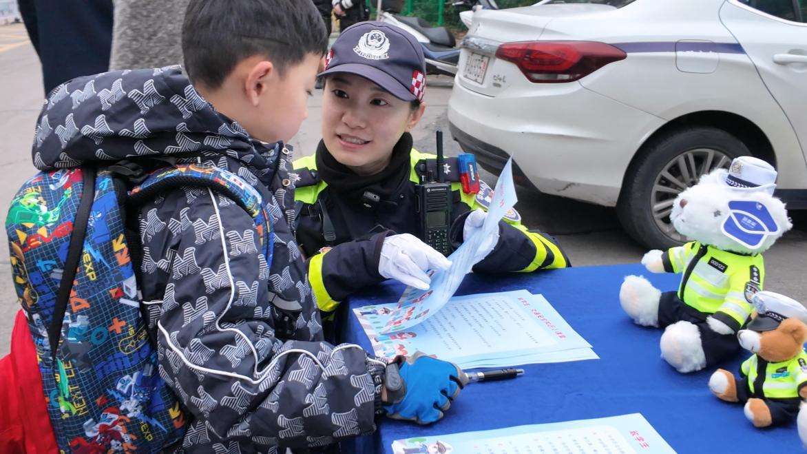 孩子们踮着脚在签名板上一笔一划写下自己的名字,拽着身边的同学、爸爸妈妈,奶声奶气地宣讲:“过马路要走斑马线,不能闯红灯!坐电动车要戴头盔!”原本熙攘的校门口,转眼成了热闹的安全互动乐园。