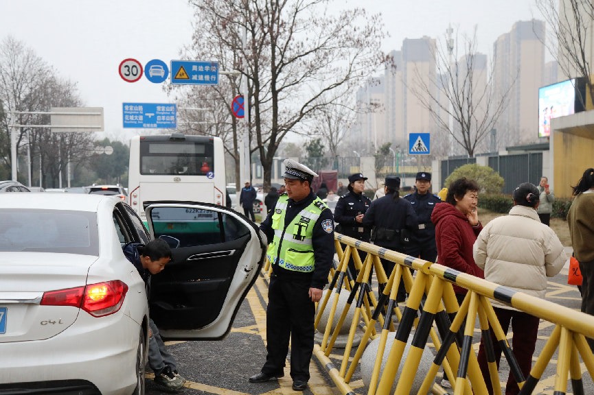 不远处的光谷第十八小学主校区门口,师傅曹幸福也在车流中不停忙碌。他抬手示意车辆减速避让,护着学生有序穿过斑马线,引导送学车辆快速驶离。