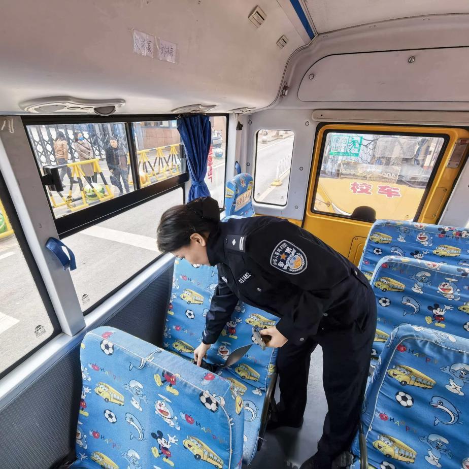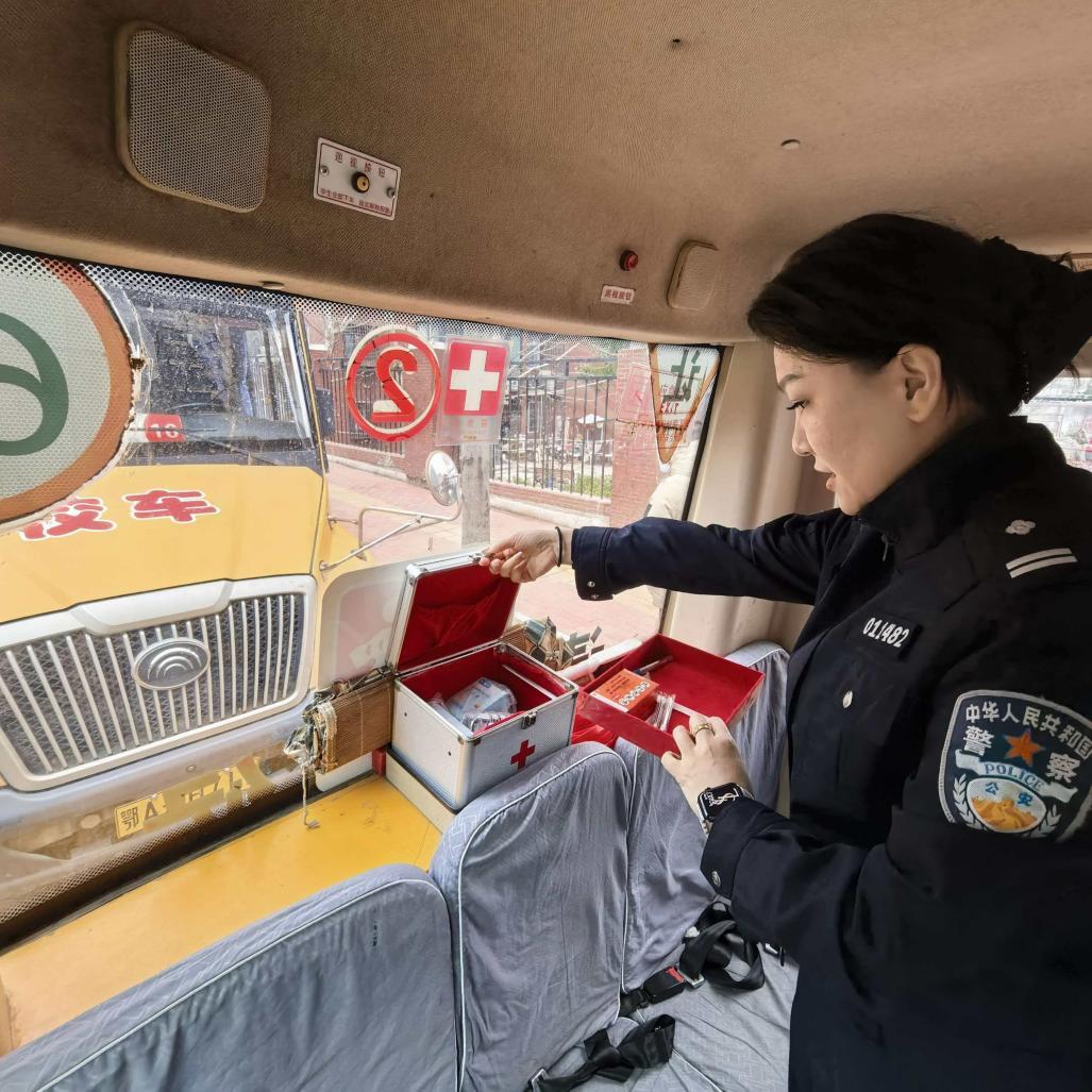 “咱们校车天天接送的都是孩子,日常的出车前检查,可一点都不能松懈。”民警王文婧蹲在车轮边,用手摸了摸轮胎纹路,又起身拉了拉车上的每一根安全带,“孩子的安全带,每天出车前都得挨个拽一拽,卡扣松了、织带坏了,马上就换,不能凑合用。”