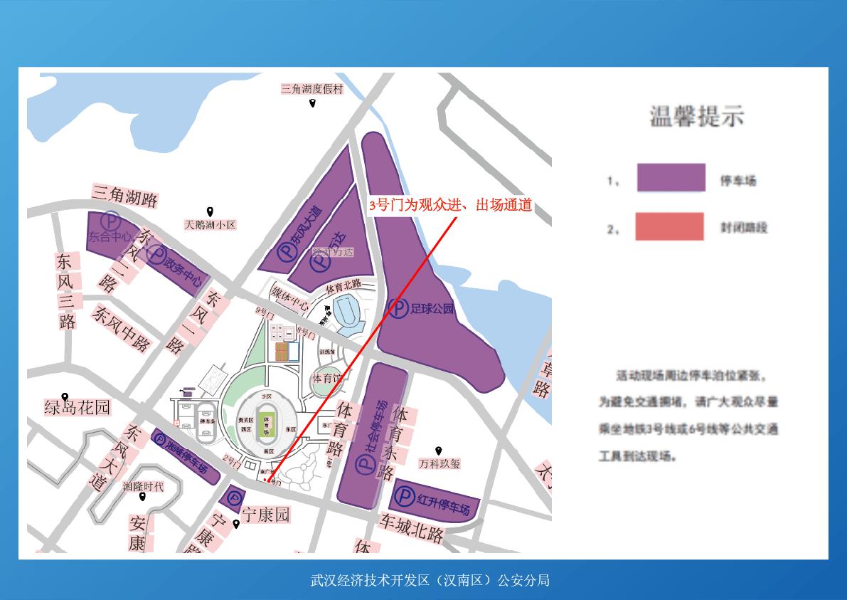 1.当天观赛观众较多,体育中心周边道路车流较大,建议市民错峰出行、提前规划路线,尽量避开体育路(东风大道至神龙大道)、太子湖路(东风大道至芳草路)、体育东路、车城北路(东风大道至车城东路)、宁康路等路段,可绕行神龙大道、沌阳大道、太子湖北路、江城大道等外围道路。